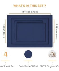 1. CERTIFICADO GOTS 100% ALGODÓN ORGÁNICO: Nuestras sábanas de algodón 100% orgánico pasan por estrictos controles de calidad para garantizar que las sábanas son no tóxicas, libres de químicos, para cumplir con los requisitos para la Certificación GOTS (Estándar Global de Textiles Orgánicos). Estas sábanas orgánicas lavadas a la piedra son respetuosas con el medio ambiente y producidas en una instalación verde y socialmente compatible. Hechas con fibras de algodón orgánico puro naturalmente cultivado, nuestras sábanas son súper frescas, crujientes y prelavadas listas para usar. 2. METETE EN SÁBANAS DE PERCAL REFRESCANTES Y AIREADAS – Frescas y crujientes al tacto, una colección ligera que te mantiene fresco en el verano, a diferencia de las pesadas sábanas de algodón egipcio o satén. El set Azul Marino King incluye 1 sábana plana 112″ W x 102″ L, 1 sábana ajustada elasticizada (78″ W x 80″ L + 14″ de bolsillo profundo) y 2 fundas de almohada King (21″ W x 40″ L). Nuestra sábana ajustada tiene un ajuste extra ceñido y presenta etiquetas de cabeza/pie para facilitar su uso. El patrón de dobladillo contrastante agrega un acabado elegante al set de dormitorio. 3. DESCANSA Y RECARGA CON ROPA DE CAMA SUSTENTABLE – Nuestras sábanas de algodón orgánico son súper suaves en tu piel. La falta de sustancias agresivas garantiza una maravillosa noche de sueño para aquellos con piel sensible. Diseñadas cuidadosamente para una experiencia de sueño tranquila, nuestras sábanas son excelentes tanto para niños como para adultos. 4. CUIDADO DEL HOGAR FÁCIL Y SÚPER DURADERO PARA UN USO SIN PROBLEMAS – Sábanas respetuosas con el medio ambiente que están hechas con tintes naturales de bajo impacto. El cuidado de lavandería es muy fácil para estas sábanas azul marino lavables a máquina – secar a baja temperatura. Asegúrate de quitarlas rápidamente después de que termine el ciclo para evitar arrugas. 5. EMPAQUE ECOLÓGICO Y GARANTÍA DE SATISFACCIÓN – Mima a tus seres queridos con sábanas de algodón orgánico puro azul marino que vienen en un elegante empaque reciclable. Cumpleaños, Navidad o Día de San Valentín – este regalo de lujo eco-consciente es único y considerado. Si por alguna razón no les gusta el regalo, puedes devolverlo en un plazo de 30 días.