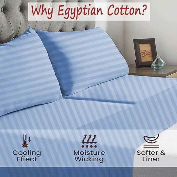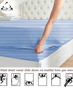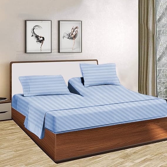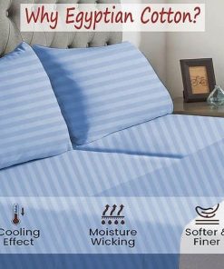 Conjunto de sábanas Split Top California King (Tamaño ajustable, Flex Top Cal King) 100% algodón egipcio, Rayas azules claras, 800 hilos, tejido de satén, bolsillo profundo de 15 pulgadas. Este juego de sábanas tiene un aspecto clásico con bolsillos profundos que brindan una sensación espléndida de ropa de cama de lujo. El conjunto incluye 1 sábana bajera dividida para la cabeza (72 x 84 pulgadas), 1 sábana plana (108 x 110 pulgadas) y 2 fundas de almohada king (20 x 40 pulgadas) que se ajustan a colchones de hasta 15 pulgadas de profundidad. Certificación Oeko-Tex estándar 100 para productos químicos nocivos. Cuidado fácil: lavar a máquina en agua fría, secar en secadora a baja temperatura.
