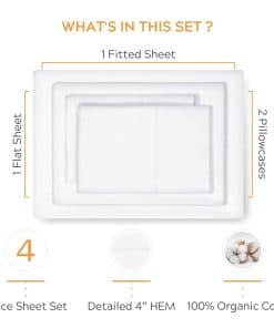 1. CERTIFICADO GOTS 100% ALGODÓN ORGÁNICO: Nuestras sábanas de algodón 100% orgánico pasan por estrictos controles de calidad para asegurar que las sábanas son no tóxicas, libres de químicos, cumpliendo con los requisitos para la Certificación GOTS (Global Organic Textile Standard). Estas sábanas orgánicas lavadas al vintage son ecológicas y producidas en una instalación verde y socialmente compatible. Hechas con fibras de algodón puro naturalmente cultivadas, nuestras sábanas son súper frescas, nítidas y prelavadas listas para usar. 2. SUMÉRGETE EN SÁBANAS DE PERCAL REFRESCANTES Y AIREADAS – Frescas y nítidas al tacto, una colección ligera que te mantiene fresco en verano, a diferencia de las pesadas sábanas de algodón egipcio o satén. El conjunto Cal King puro blanco incluye 1 sábana plana de 108″ de ancho x 106″ de largo, 1 sábana ajustada elastizada (74″ de ancho x 84″ de largo + 14″ de bolsillo profundo) y 2 fundas de almohada king size (21″ de ancho x 40″ de largo). Nuestra sábana ajustada tiene un ajuste extra ceñido y cuenta con etiquetas de cabeza/pie para facilitar su uso. El patrón de dobladillo de contraste añade un acabado elegante al conjunto de dormitorio. 3. DESCANSA Y RECARGA CON ROPA DE CAMA SOSTENIBLE – Nuestras sábanas de algodón orgánico son súper suaves con tu piel. La falta de sustancias agresivas asegura una maravillosa noche de sueño para aquellos con piel sensible. Diseñadas cuidadosamente para una experiencia de sueño tranquila, nuestras sábanas son ideales tanto para niños como para adultos. 4. CUIDADO FÁCIL EN CASA Y SUPERDURADERAS PARA UN USO SIN PROBLEMAS – Sábanas respetuosas con el medio ambiente que están hechas con tintes naturales de bajo impacto. El cuidado de lavandería es súper fácil para estas sábanas lavables a máquina – secar a baja temperatura. Asegúrate de quitarlas rápidamente después de que termine el ciclo para evitar arrugas. 5. EMPAQUE ECOLÓGICO Y GARANTÍA DE SATISFACCIÓN – Regala a tus seres queridos sábanas de algodón puro orgánico que vienen en un elegante empaque reciclable. Cumpleaños, Navidad o Día de San Valentín – este regalo de lujo respetuoso con el medio ambiente es único y considerado. Si por alguna razón no les gusta el regalo, puedes devolverlo en un plazo de 30 días.