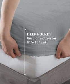 Nuestro juego de sábanas queen está diseñado para adaptarse perfectamente a colchones de tamaño queen, incluidos aquellos con profundidad extra. Las sábanas queen de bolsillo profundo, con un bolsillo de 16 pulgadas de profundidad y elástico alrededor, garantizan un ajuste seguro y ceñido, evitando cualquier deslizamiento o agrupamiento durante la noche. Di adiós a la necesidad constante de ajustes y disfruta de una superficie suave y sin arrugas cada vez que haces tu cama.