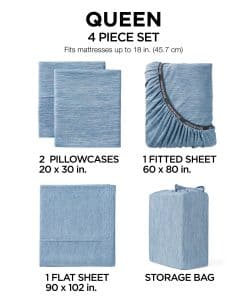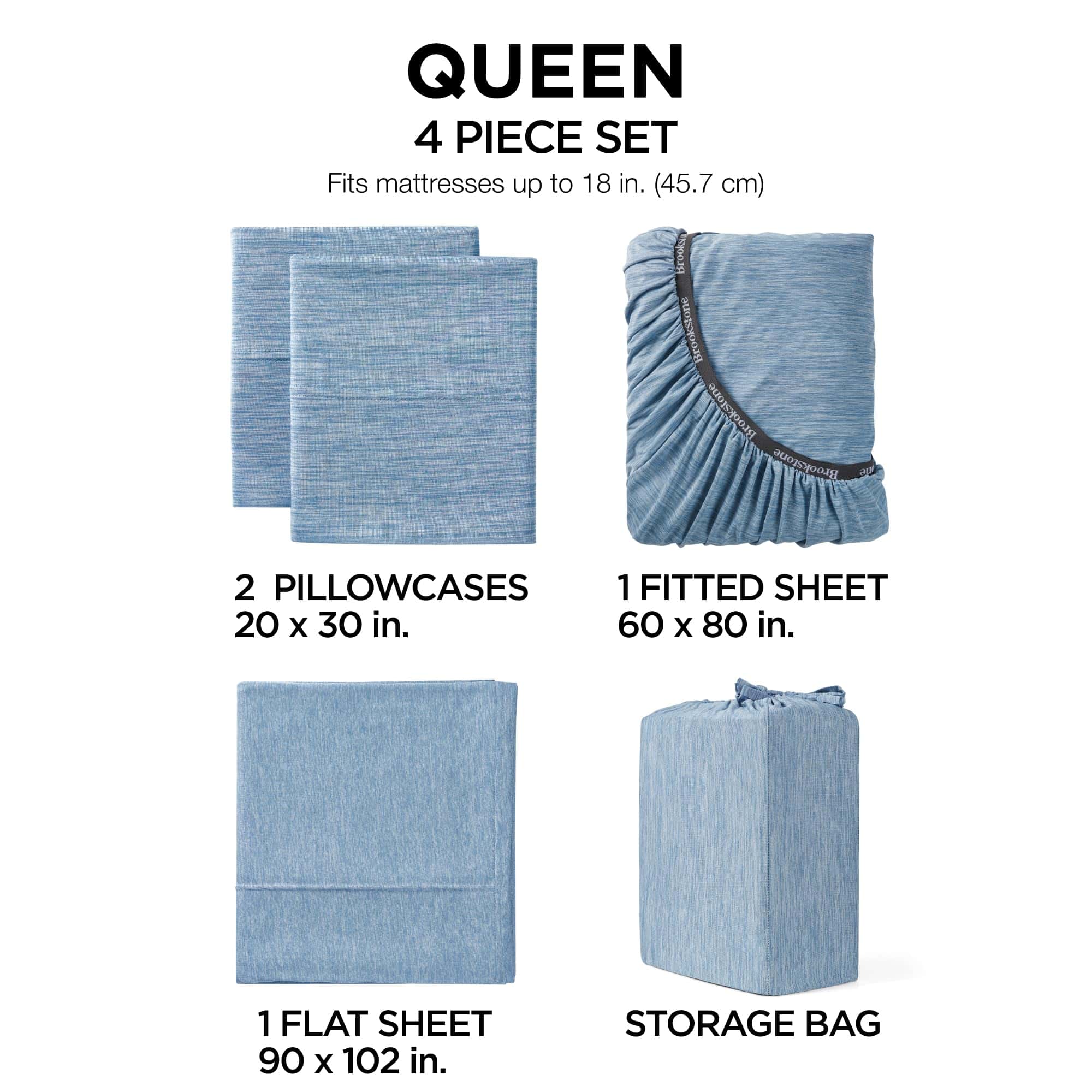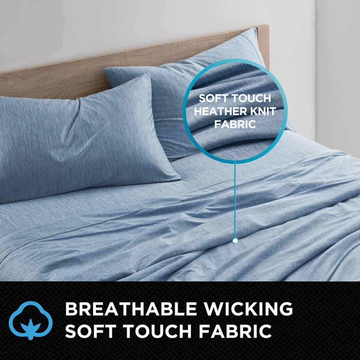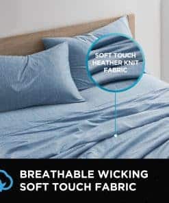 Sábana plana: 100% poliéster Heathered Knit, 150 gsm Juego de 4 piezas incluye: (1) sábana plana, (1) sábana ajustada, (2) fundas de almohada (El tamaño Twin es un conjunto de 3 piezas con (1) funda de almohada)