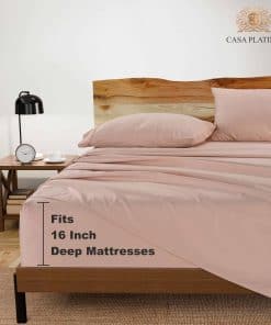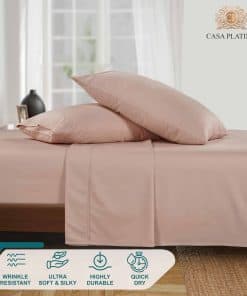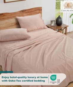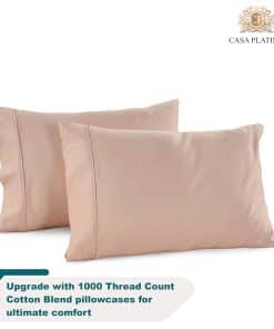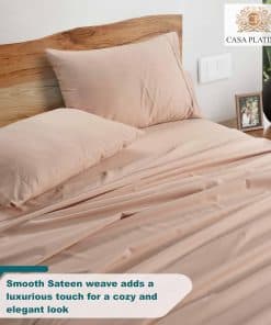Duerma con elegancia y comodidad con la ropa de cama de Casa Platino. Nuestras sábanas de lujo están hechas de una mezcla única de algodón ultra suave y poliéster de alta calidad. El elegante tejido de satén se siente suave como la seda contra la piel y brinda un toque de elegancia a cualquier dormitorio. Nuestras sábanas y fundas de almohada ricas en algodón brindan confort sin comprometer el estilo o la calidad. El material ligero y transpirable se siente fresco durante las noches calurosas de verano y lo mantiene caliente durante el invierno. Siéntase descansado y renovado durante todo el año. Nuestra gama de sábanas de 1000 hilos es ultra suave, extremadamente transpirable, altamente duradera y resistente, duradera, libre de arrugas, resistente a la decoloración y a la contracción y lujosamente sedosa. Las sábanas de Casa Platino son seguras para su piel y para el medio ambiente. Nuestros textiles se fabrican en una fábrica certificada por OEKO-TEX Standard 100, lo que garantiza que no se usan productos químicos dañinos.