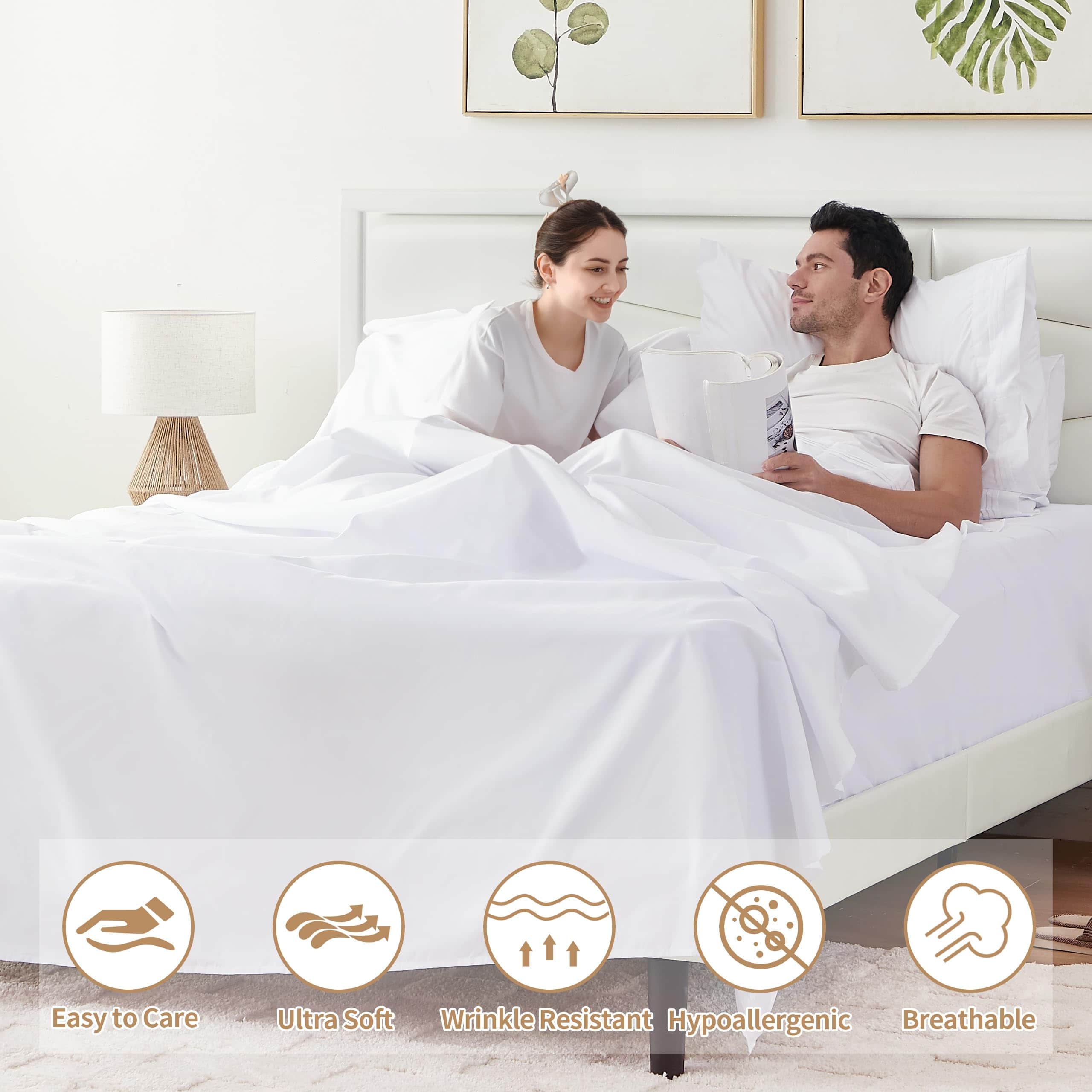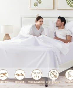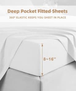 1. Bolsillo profundo y elasticidad envolvente. Este juego de sábanas queen cuenta con bandas elásticas en todo el contorno, ingeniosamente integradas con un diseño de bolsillo profundo, asegurando un ajuste impecable sobre tu colchón. Despídete de las arrugas antiestéticas mientras tu ropa de cama abraza el colchón ajustadamente, presentando un refugio perfecto y acogedor para una noche de descanso reparador. 2. Tejido patentado suave y fresco. ¡Las sábanas refrescantes queen son como envolverse en una suave nube! Diseñadas para ser suaves con tu piel y excepcionalmente transpirables. Prepárate para ser encantado por su tacto reconfortante, nutriendo tu sueño y elevando tu descanso a nuevas alturas de serenidad dichosa. 3. Resistente a las arrugas. Di adiós a las arrugas con nuestro juego de sábanas queen size, meticulosamente confeccionado con tejido premium que cuenta con notables propiedades resistentes a las arrugas. Experimenta la alegría de mantener sin esfuerzo una apariencia nítida y suave, asegurando que tu cama siempre luzca impecablemente ordenada. 4. Resistente a la decoloración. Nuestro conjunto de ropa de cama queen de 6 piezas, donde las técnicas avanzadas de impresión y teñido se unen para colores resistentes a la decoloración. Eleva tu vida diaria con ropa de cama que no solo soporta la prueba del tiempo, sino que también añade un toque elegante a la decoración de tu dormitorio. ¡Es la fusión perfecta de durabilidad y elegancia chic! 5. Juego de sábanas de 6 piezas para cama queen. Nuestras sábanas queen de bolsillo profundo incluyen 4 fundas de almohada (20×30″), 1 sábana ajustable (60 80 16″) y 1 sábana plana 90 102″. Además, las sábanas también están diseñadas con pliegues prensados y decal para una apariencia ordenada, haciendo que tu cama se vea más elegante y hermosa brindando una experiencia visual confortable.