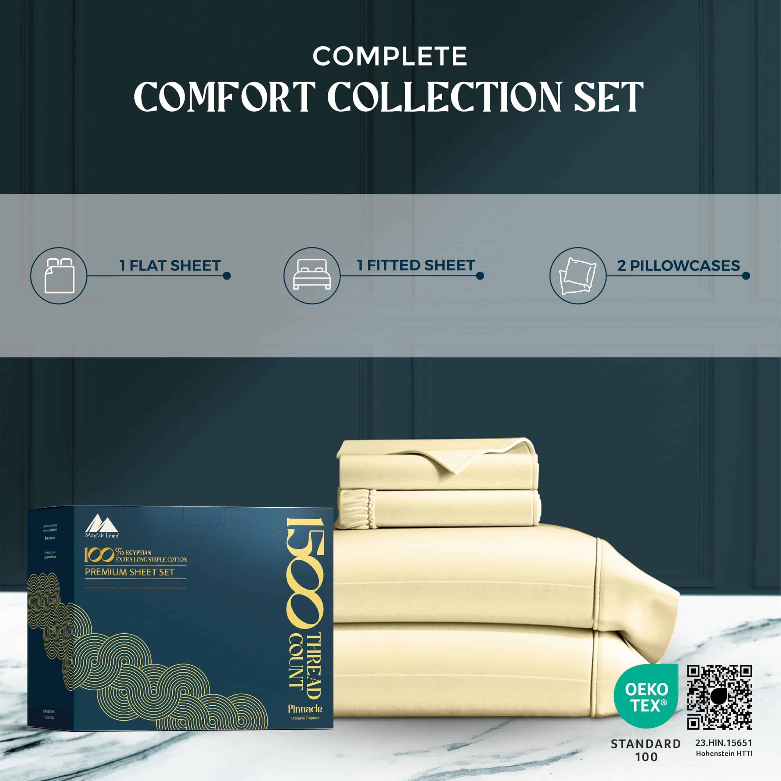 Includes a Complete 4-Piece Sheet Set: Mayfair Linen�s 1500 thread count Egyptian cotton queen sheets sets include: 1 Flat Sheet (90″ x 102″), 1 Fitted Sheet (60″ x 80″ + 16″), and 2 Standard/Queen Pillowcases (21″ x 32″). The fitted sheet guarantees a taut fit on the mattress with extra deep pocket to accommodate all kinds of adjustable mattresses, and the elastic to secure the sheet to the mattress. Pillow case has envelope closures to tuck in the pillows inside.