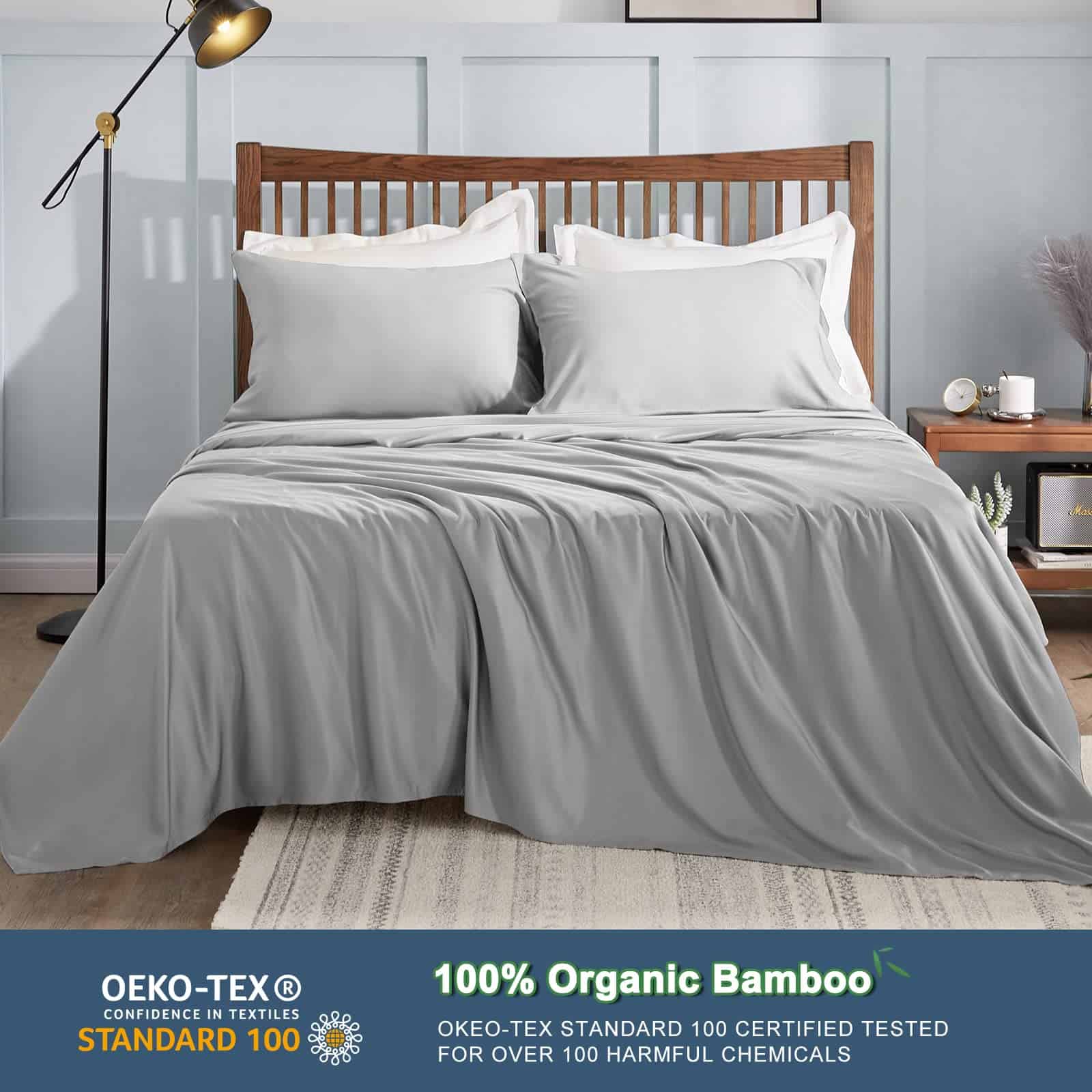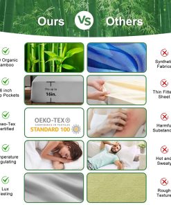 El rayón derivado de bambú es una opción de alta gama para la ropa de cama, ya que es suave como la seda, fresco al tacto y cálido cuando hace frío, lo que lo convierte en una excelente opción para personas con sudor nocturno. Además, la sábana ajustable está diseñada con bolsillos profundos de 16 pulgadas, lo que la hace perfecta para colchones de mayor tamaño.