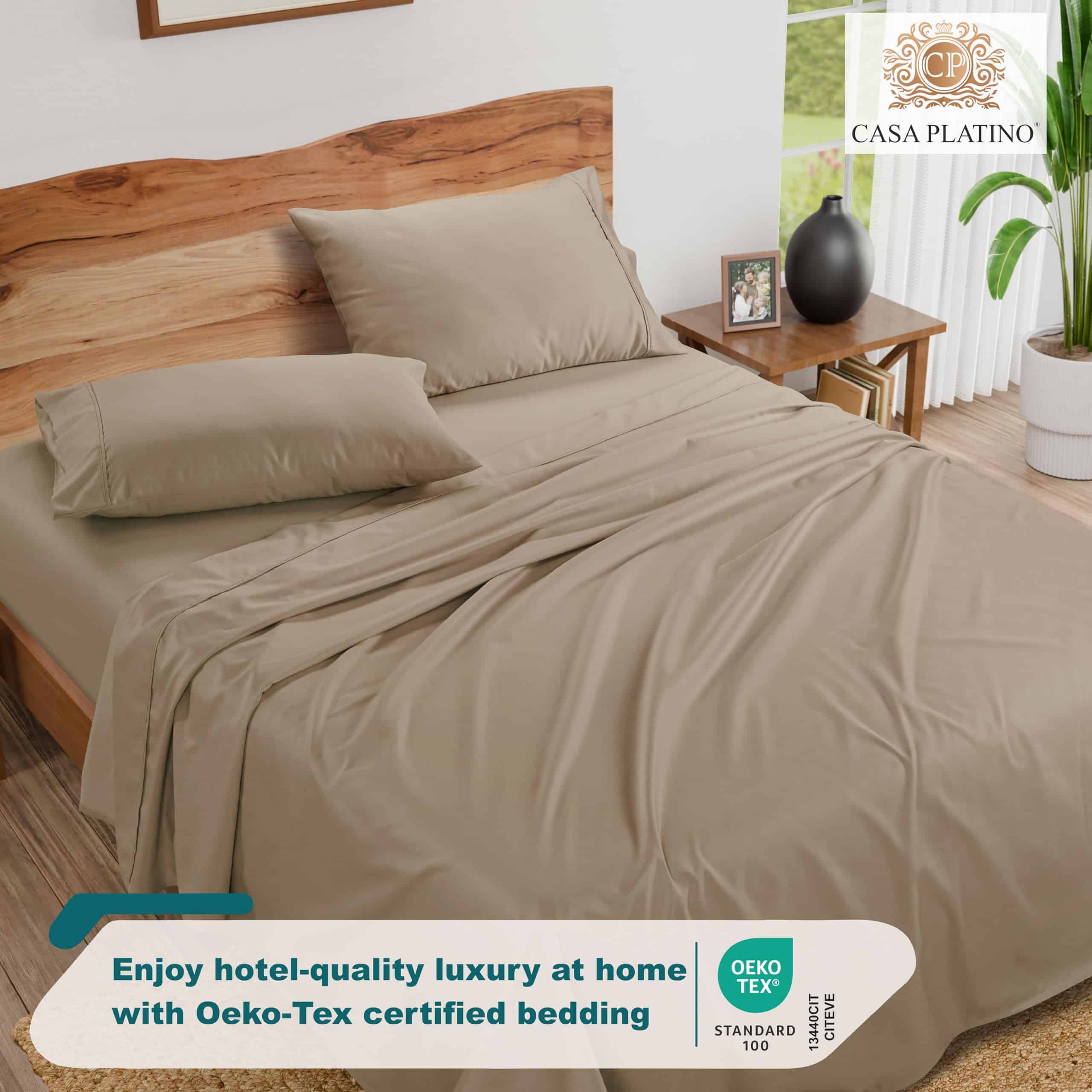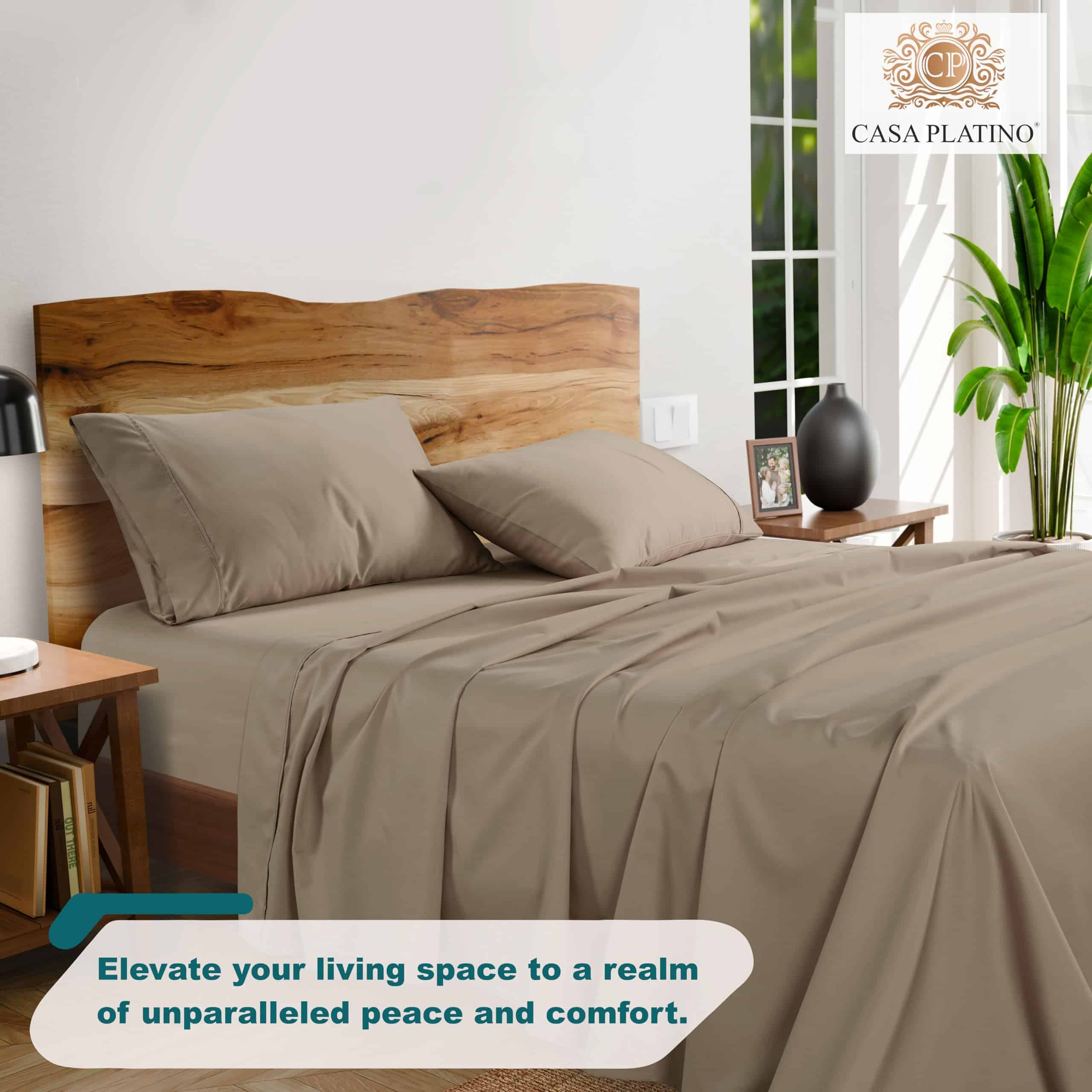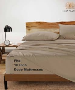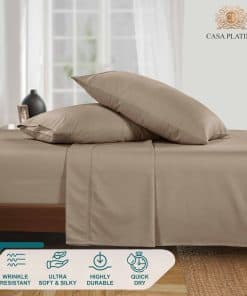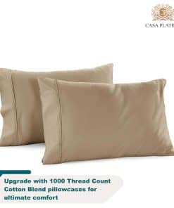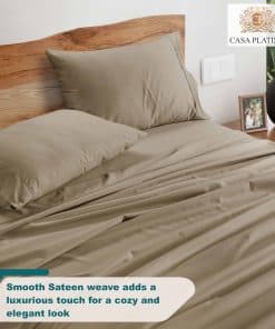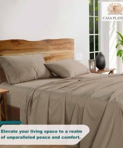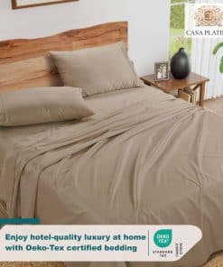 Duerme con elegancia y comodidad con la ropa de cama de Casa Platino. Nuestras sábanas de lujo están hechas de una mezcla única de algodón ultra suave y poliéster de alta calidad. El tejido de satén elegante se siente sedoso suave contra la piel y proporciona un toque de elegancia a cualquier dormitorio. Nuestras sábanas y fundas de almohada ricas en algodón brindan comodidad sin comprometer el estilo o la calidad. El material ligero y transpirable se siente fresco durante las noches calurosas de verano y te mantiene cálido durante el invierno. Siéntete descansado y renovado durante todo el año. Nuestra gama de sábanas de 1000 Hilos es ultra suave, extremadamente transpirable, altamente duradera y resistente, duradera, sin arrugas, resistente a la decoloración y a la contracción y lujosamente sedosa. Las sábanas de Casa Platino son seguras para tu piel y para el medio ambiente. Nuestros textiles se fabrican en una fábrica certificada OEKO-TEX Standard 100, lo que garantiza que no se utilizan productos químicos dañinos.