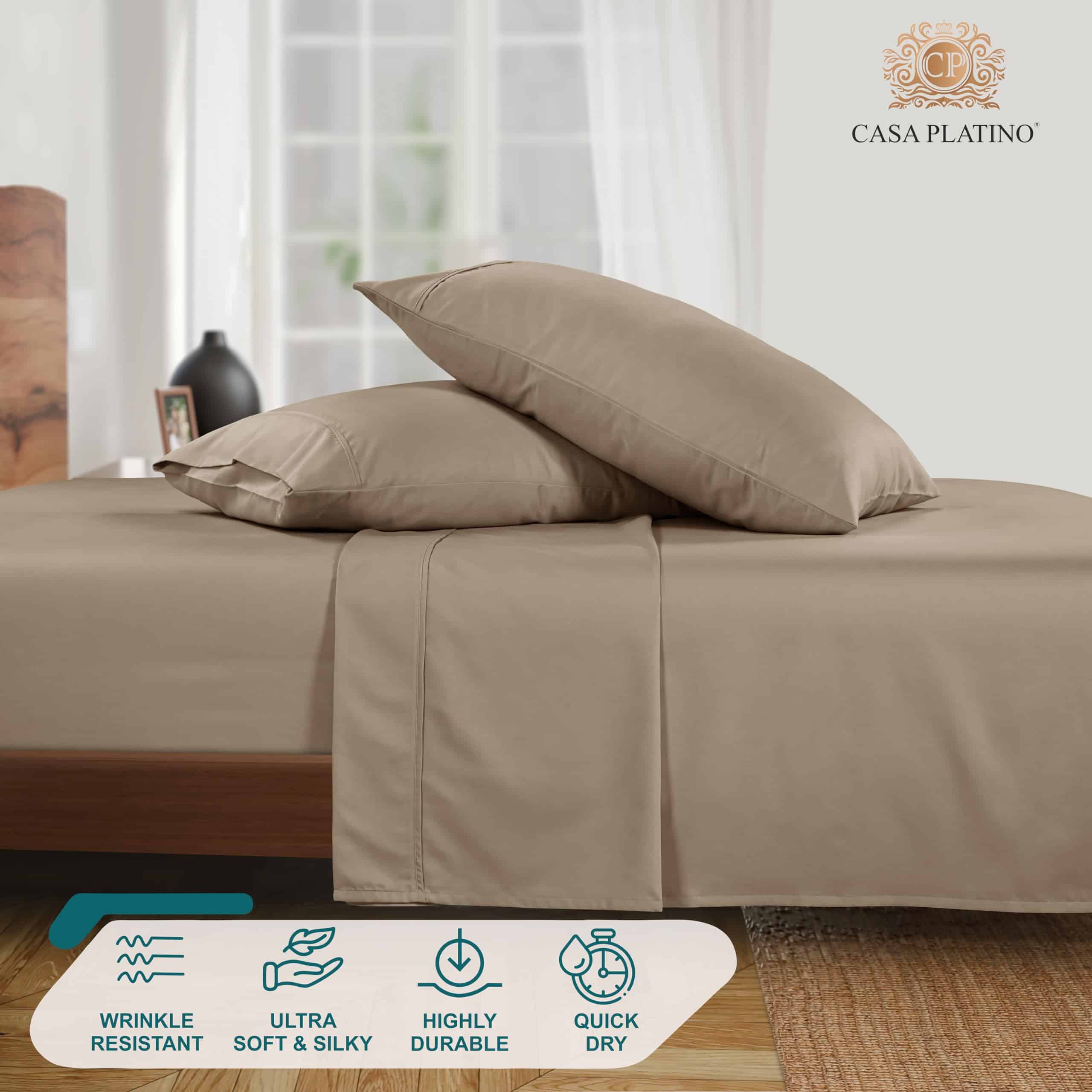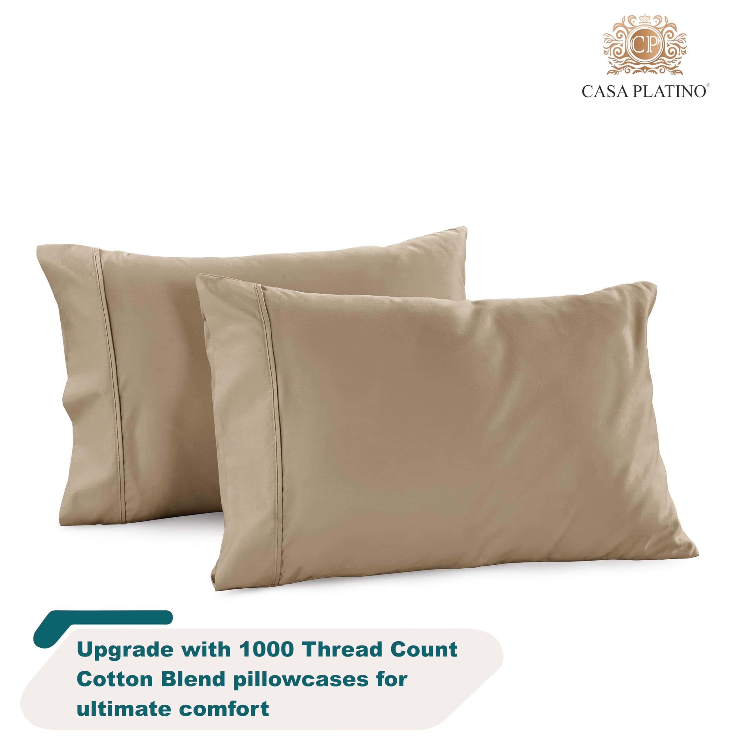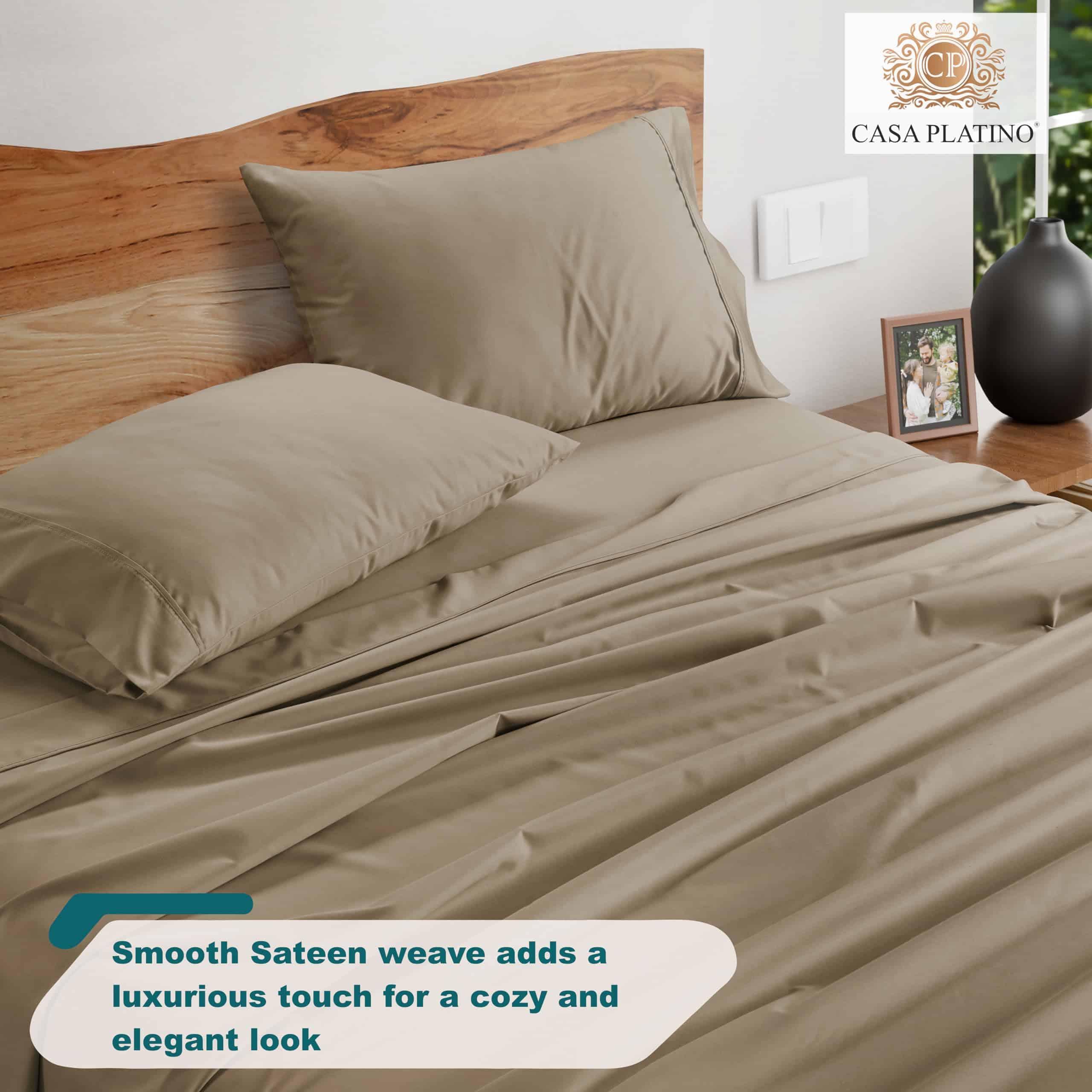 Duerme con elegancia y comodidad con la ropa de cama de Casa Platino. Nuestras sábanas de lujo están hechas de una mezcla única de algodón ultra suave y poliéster de alta calidad. El tejido de satén elegante se siente sedoso suave contra la piel y proporciona un toque de elegancia a cualquier dormitorio. Nuestras sábanas y fundas de almohada ricas en algodón brindan comodidad sin comprometer el estilo o la calidad. El material ligero y transpirable se siente fresco durante las noches calurosas de verano y te mantiene cálido durante el invierno. Siéntete descansado y renovado durante todo el año. Nuestra gama de sábanas de 1000 Hilos es ultra suave, extremadamente transpirable, altamente duradera y resistente, duradera, sin arrugas, resistente a la decoloración y a la contracción y lujosamente sedosa. Las sábanas de Casa Platino son seguras para tu piel y para el medio ambiente. Nuestros textiles se fabrican en una fábrica certificada OEKO-TEX Standard 100, lo que garantiza que no se utilizan productos químicos dañinos.
