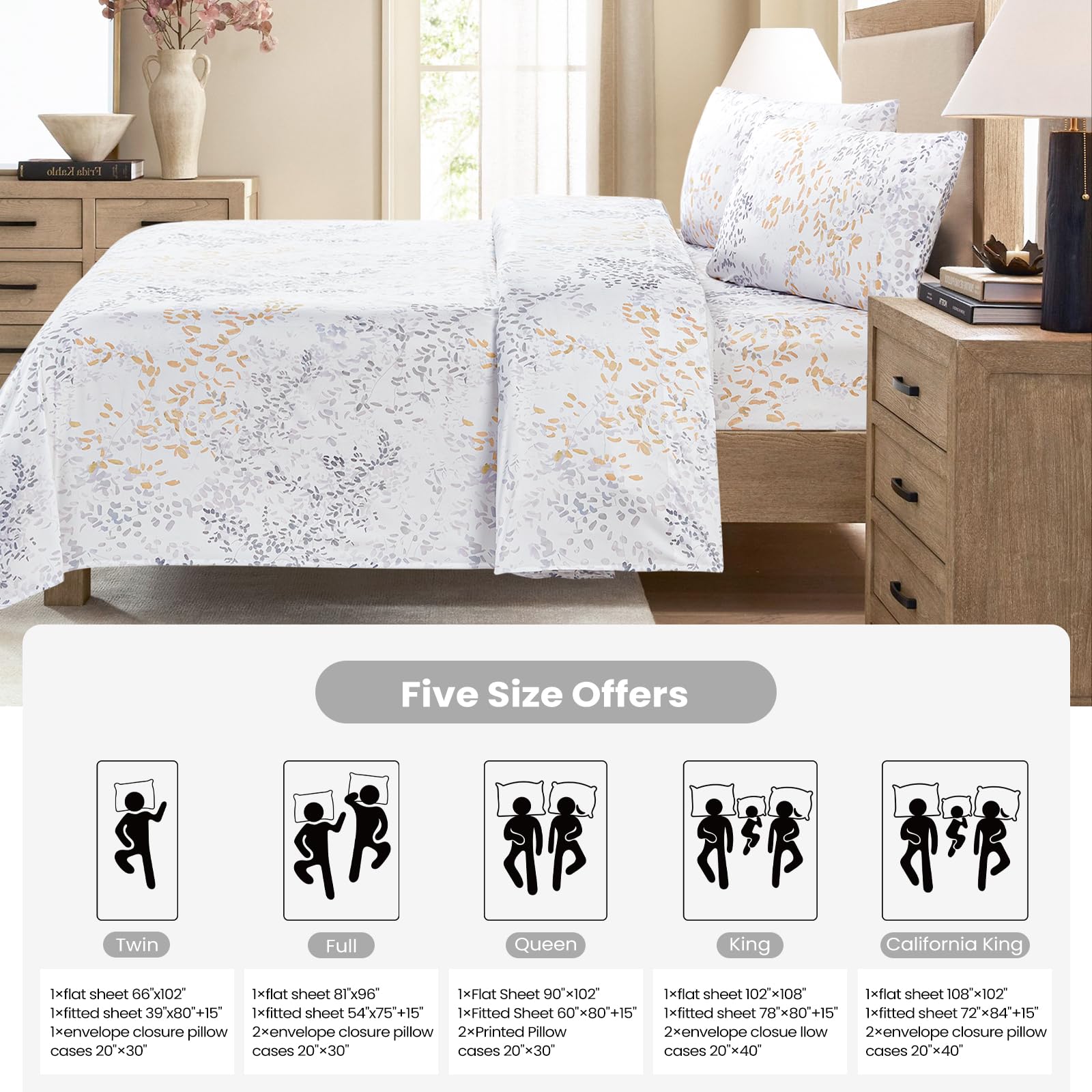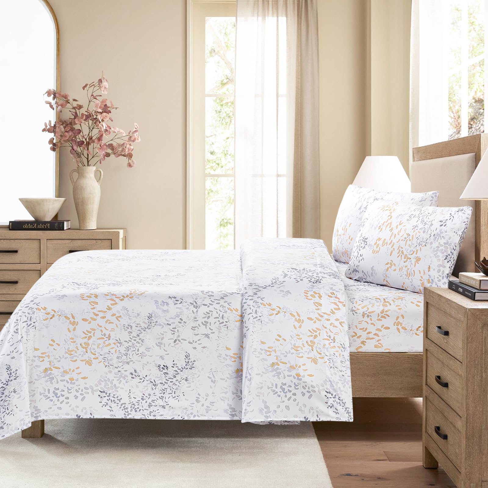 BLOOM STUDIO Queen Size Sheets 4 Piece Be full of colour Sheets 15 Deep Pocket Soft 100% Microfiber Bedsheet Flowers on beige background Pattern Luxury Bedding Sheet Set,Easy Care, Breathable, Wrinkle Free. Calidad premium: nuestras sábanas estampadas utilizan microfibra de 85GSM y tejidos de lujo de doble cepillado súper suaves. Sensación suave como el algodón y transpirable; resistente a la decoloración, encogimiento y arrugas; más grueso y duradero que el algodón, con una fuerte costura para evitar roturas y tener una vida útil más larga. Crea un ambiente cálido para dormir, y el tacto suave y cómodo garantiza que tendrás un sueño de buena calidad! Diversos patrones hermosos: dile adiós a la monotonía de las sábanas de color sólido-Las sábanas florales de Bloom Studio presentan superficies de acuarela inspiradas en flores y sábanas estampadas de microfibra únicas que combinan perfectamente con tus objetos de dormitorio en todas las estaciones. Muchas elegantes impresiones están disponibles para que elijas, como diferentes colores (azul, amarillo, marrón, gris, verde, rojo, rosa), estilos (azteca, bohemio, chino, marroquí y americano) y temas (art déco, plantas, flores y jardines). Ajuste perfecto y fácil cuidado: la sábana ajustable de bolsillo profundo es adecuada para colchones gruesos de hasta 15 pulgadas (360 elástica, por lo que puede estirarse, NUNCA se rompe y se desliza). Nuestro juego de sábanas de lujo es lavable a máquina en agua fría y se seca rápidamente en secadora. Lavado a máquina en modo suave, con control de temperatura a 35 . Juego de sábanas Queen 4PC (1) sábana plana: 90″ x 102″, (1) sábana ajustada: 60″ x 80″ x 15″, (2) funda de almohada: 20″ x 30″. Las sábanas ligeras y suaves de flores azules son adecuadas para la habitación de adultos o colchones de hotel. Paquete de regalo: el juego de sábanas estampado de Bloom Studio es un gran regalo para niños, niñas, niños, hombres y mujeres, mamás y papás, Día de San Valentín – Pascua – Día de la Madre – Día del Padre, cumpleaños y Navidad. Si no estás satisfecho con tu compra por cualquier razón en cualquier momento, puedes devolverla, sin hacer preguntas. Nos enorgullecemos de ofrecer el mejor servicio al cliente absoluto de la industria. Compra ahora con confianza.