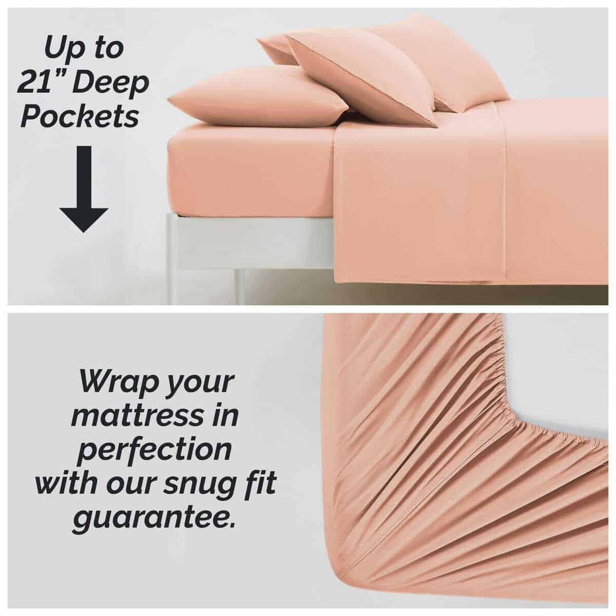 2. SÁBANAS QUEEN DE BOLSILLO MUY PROFUNDO PERMANECEN AJUSTADAS EN COLCHONES TAMAÑO QUEEN: La sábana bajera de 21″ de bolsillo profundo tiene elástico resistente alrededor de todo el dobladillo para permanecer ajustada en colchones gruesos y toppers, incluyendo los de almohada, tipo Euro-top, toppers de espuma. Ya no se desajustan.