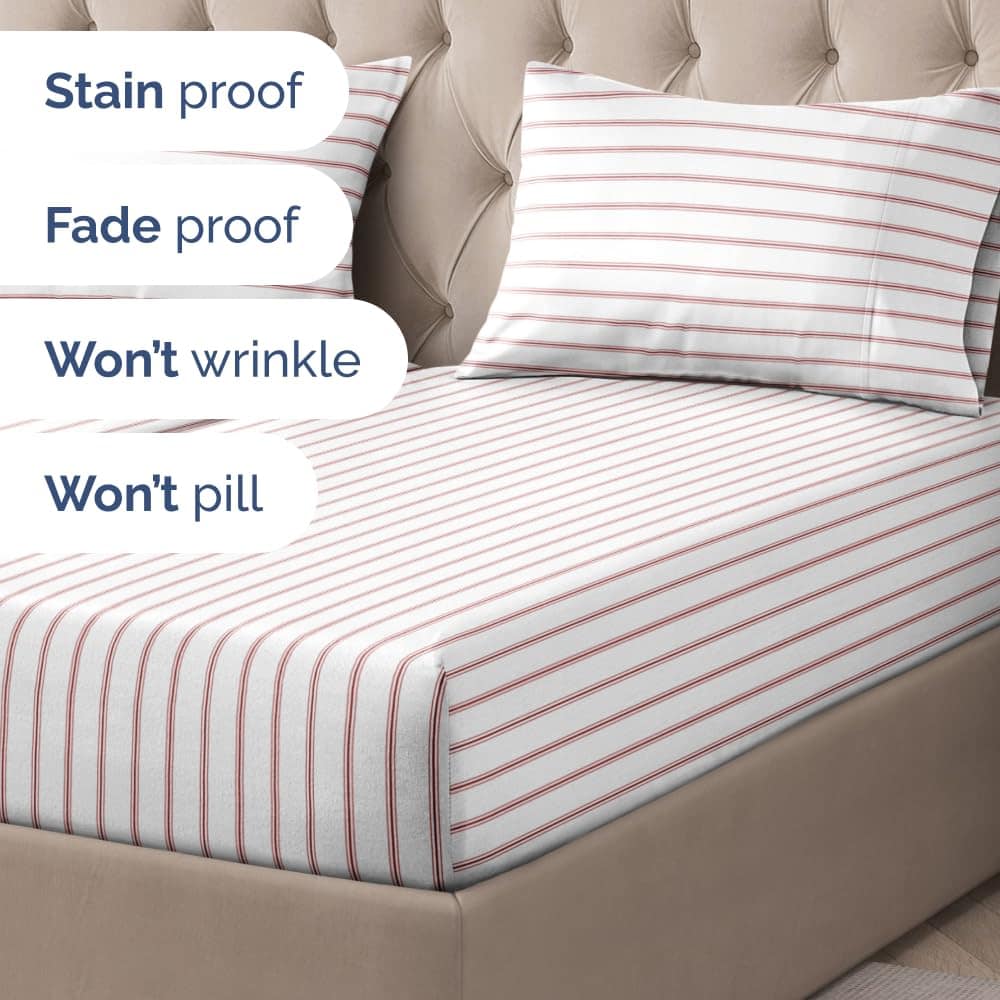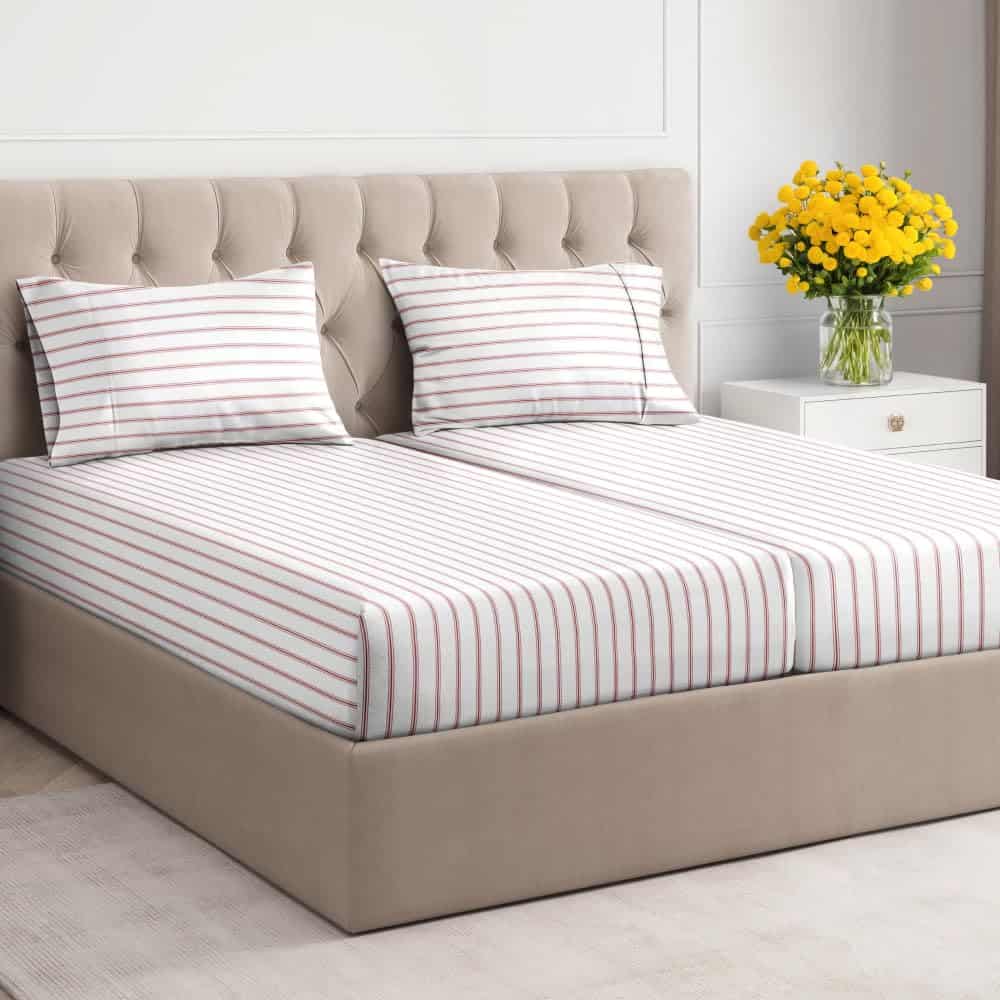 Juego de sábanas Split King de color baya profundo rubí brillante blanco ropa de cama algodón patrón natural vertical profundo bolsillos de bambú hotel microfibra sábana de lujo decoración de habitación patrón fresco y fundas de almohada sábanas de lino suaves a rayas premium orgánicas elástico