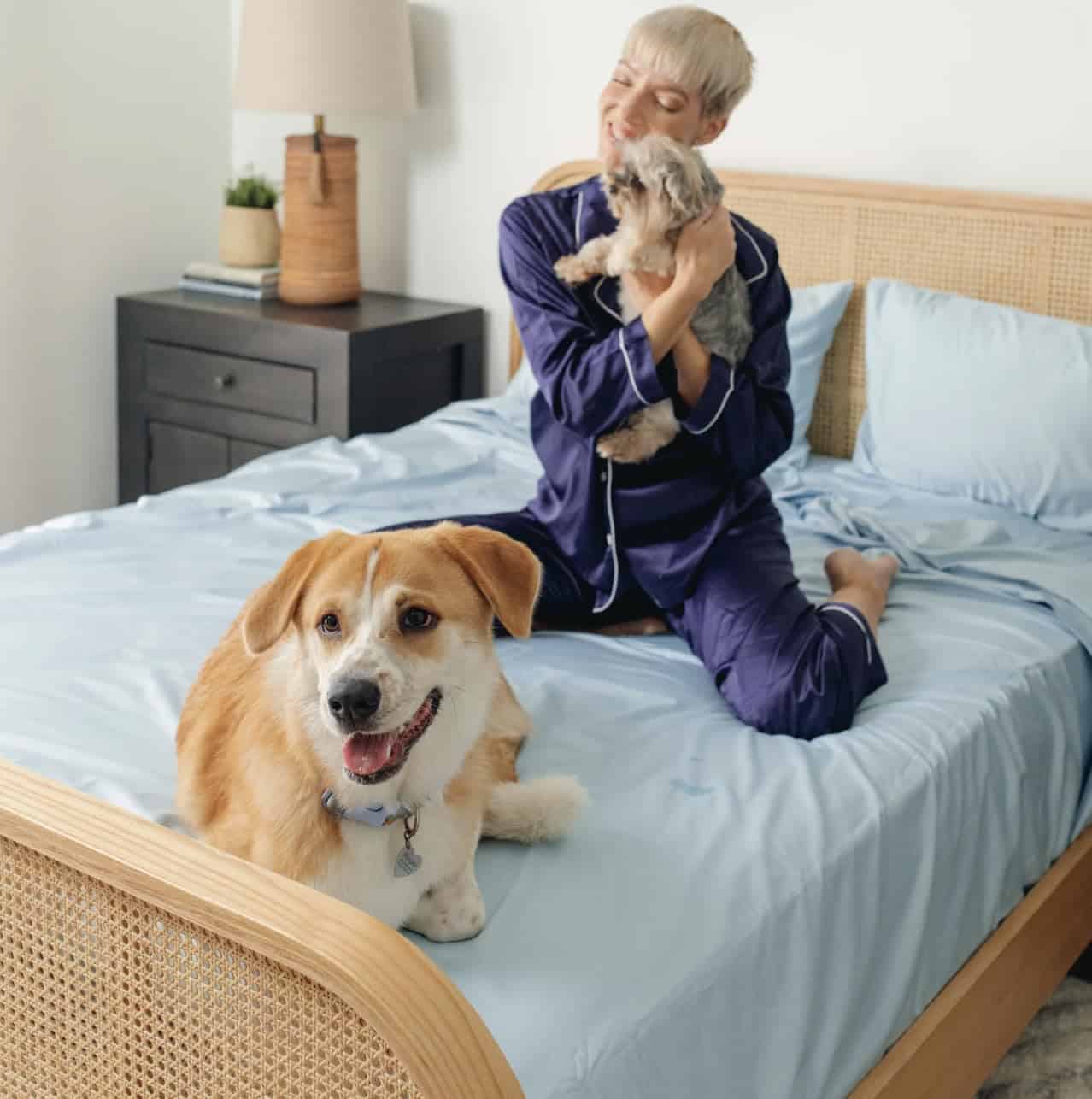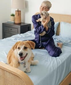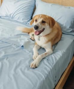El juego de sábanas resistentes al cabello y refrigerantes PupSheets incluye una sábana plana, una sábana ajustable y dos fundas de almohada. Esta ropa de cama amigable para mascotas es absorbente de humedad, duradera y está hecha de materiales de origen sostenible. Hecho con una mezcla de tejido de 400 hilos de algodón 70% y lyocell de eucalipto 30% que es suave como la seda, lujosamente suave y naturalmente transpirable.