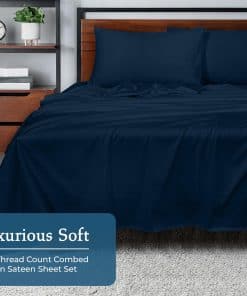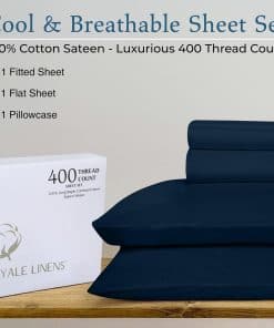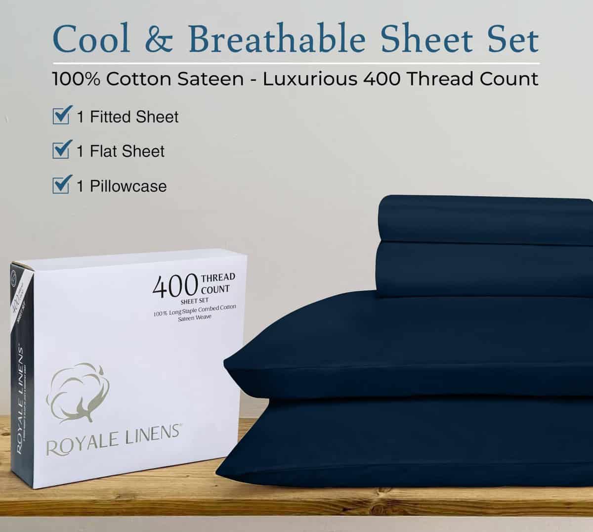 2. JUEGO DE SÁBANAS DE 400 HILOS DE 3 PIEZAS: El juego de sábana de satén 100% algodón de 400 hilos de Royales Linens incluye: 1 sábana plana de 66×96 pulgadas, 1 sábana ajustable de 39×75 pulgadas con una caída de 16 pulgadas y 1 funda de almohada de 20×30 pulgadas con un dobladillo de 4 pulgadas y cierre de sobre.