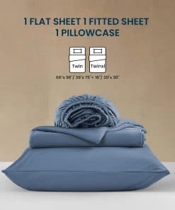 4. JUEGO DE SÁBANAS DE 3 PIEZAS – 1 Sábana plana 96×66 pulgadas, 1 Sábana ajustada 75×39 pulgadas, 1 Funda de almohada 20×30 pulgadas.