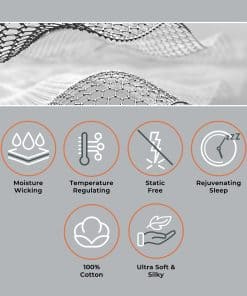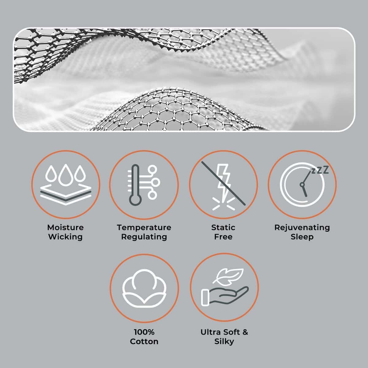1. RENUEVA TU SUEÑO: Eleva tu experiencia de sueño con nuestra ropa de cama innovadora, infundida con partículas de grafeno para una regulación térmica avanzada y absorción de humedad. Despiértate sintiéndote fresco y rejuvenecido todas las mañanas con estas sábanas y fundas de almohada refrescantes diseñadas para un confort óptimo. 2. JUEGO COMPLETO TAMAÑO COMPLETO: Este juego de ropa de cama completo incluye 1 sábana plana (82″ x 96″), 1 sábana ajustable (54″ x 75″) y 2 fundas de almohada estándar (20″ x 30″). Es la combinación perfecta para darle a tu dormitorio una actualización instantánea en comodidad y estilo. 3. LUJO Y DURABILIDAD COMBINADOS: Elaborado con algodón de fibra larga premium y un tejido de satén suave, nuestra ropa de cama infundida con grafeno proporciona un tacto suave como la seda y resistencia suficiente para soportar lavados frecuentes. Experimenta el equilibrio perfecto entre lujo y resistencia mientras estas sábanas mantienen su forma, color y suavidad con el paso del tiempo. 4. AJUSTE PERFECTO PARA COLCHONES DE HASTA 18 PULGADAS: Diseñada con nuestra tecnología patentada True Grip, la sábana ajustable se mantiene firmemente en su lugar en colchones de hasta 18 pulgadas de profundidad. El diseño de bolsillo profundo garantiza un ajuste impecable y un bolsillo lateral adicional ofrece almacenamiento conveniente para tus elementos esenciales de la noche como teléfonos o controles remotos. 5. ARTESANÍA EN LA QUE PUEDES CONFIAR: Elaborada de manera experta en nuestra fábrica de vanguardia en India, cada pieza de nuestra ropa de cama se somete a estrictos controles de calidad. Descansa tranquilo con nuestra garantía de satisfacción de 30 días, si no estás completamente satisfecho, reemplazaremos tu producto sin costo alguno, incluso después de su uso y lavado.
