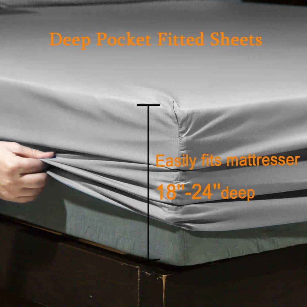 2. Juego de sábanas de lujo tamaño Full de 6 piezas – 1 sábana plana de 81″x96″, 1 sábana ajustable de 54″x75″x21″ tiene elástico para que se pueda estirar, 4 fundas de almohada de 20″x30″. Bolsillos profundos que se ajustan a colchones de hasta 18″-24″ de profundidad con elástico alrededor de la sábana ajustable. ¡Estas sábanas se agarran y ajustan mejor que cualquier otro juego de sábanas! El juego de sábanas está diseñado para adaptarse a casi todos los colchones con una profundidad que no exceda los 24″. Con elasticidad adicional y elástico duradero, la sábana ajustable está diseñada para permanecer ajustada y fija a tu colchón.