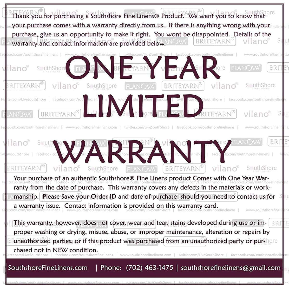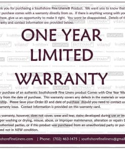 5. Compañía Familiar con Base en Las Vegas: En Southshore Fine Linens, nos enfocamos al 100% en productos de calidad y un servicio al cliente excepcional. Estamos seguros de que te encantarán nuestros productos y los respaldamos con un año completo de soporte en calidad de construcción y materiales.
