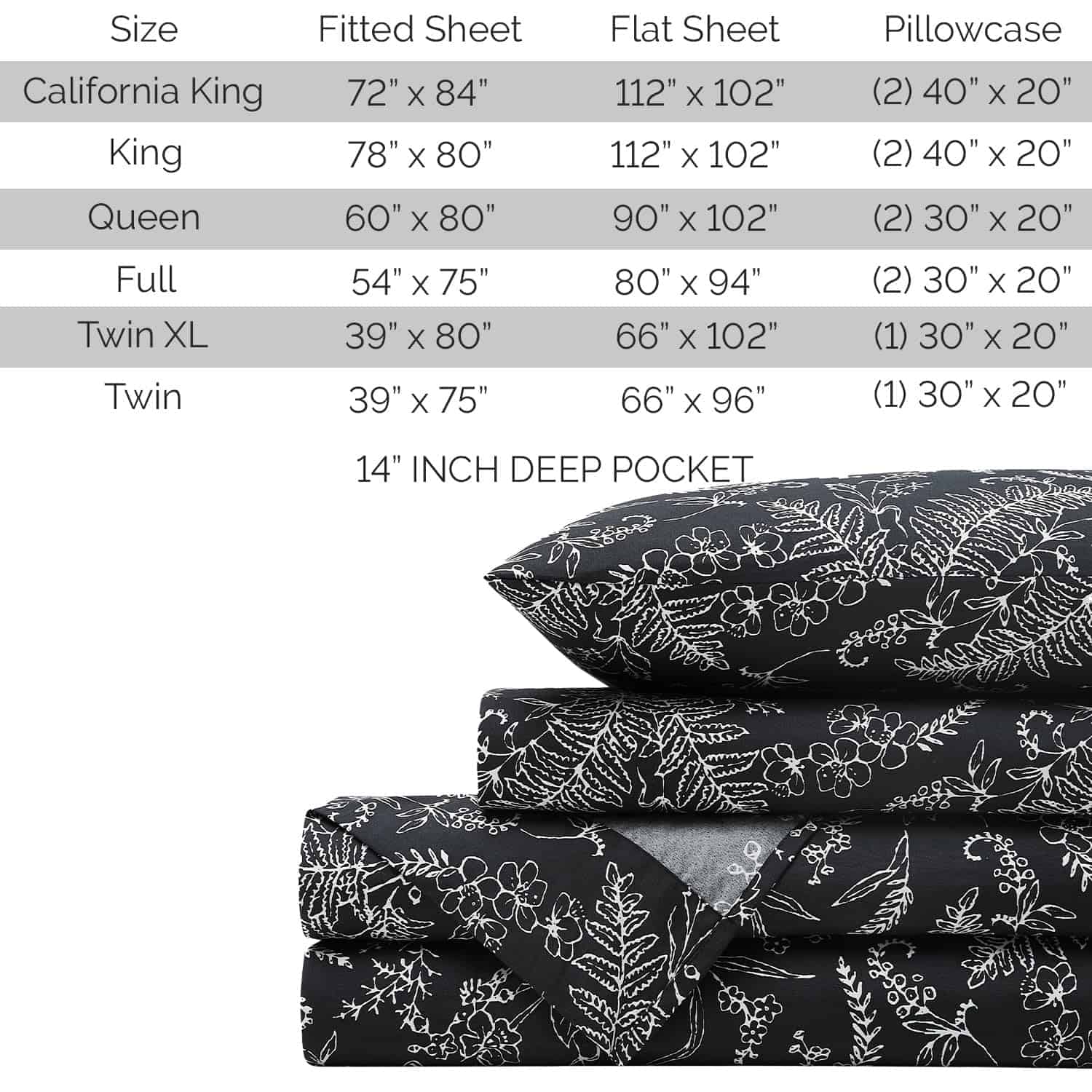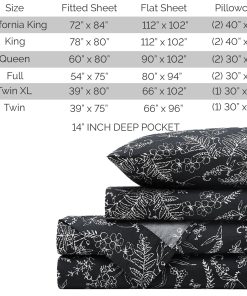 1. Tamaño California King: Incluye 1 Sábana Ajustable con Bolsillo Extra Profundo totalmente elástica (72 pulgadas x 84 pulgadas, se ajusta a un colchón de hasta 14 pulgadas), 1 Sábana Plana King (112″ x 102″) y DOS Fundas de Almohada Estándar (20″ x 40″) con cierre de sobre europeo.