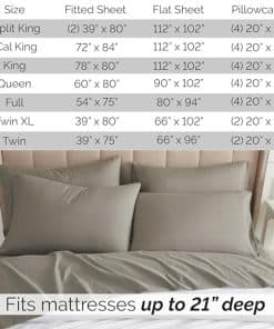 5. 6-PIECE DEEP POCKET KING SIZE SHEET SET INCLUDES: (1) Sábana ajustable de 78″ de ancho x 80″ de largo x 21″ de profundidad; (1) Sábana plana extragrande de 112″ de ancho x 102″ de largo; (4) Fundas de almohada de 20″ de ancho x 40″ de largo.