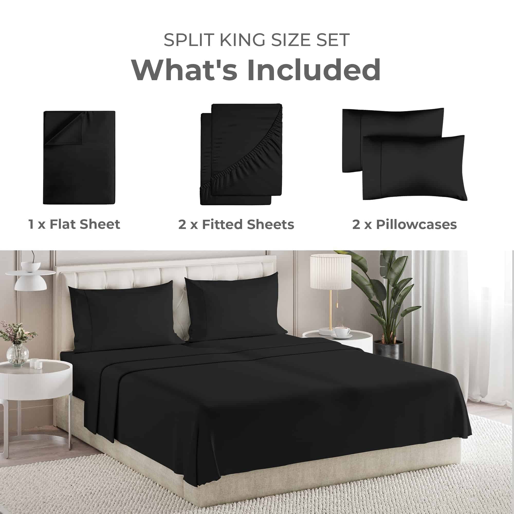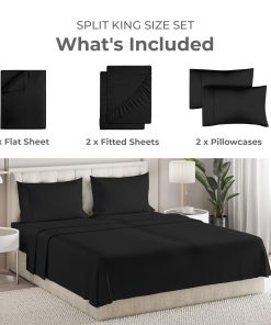 1. JUEGO DE SÁBANAS SPLIT KING DE 5 PIEZAS: El juego de sábanas de tamaño Split King incluye 1 sábana plana, 2 sábanas ajustables y 2 fundas de almohada. Frías, cómodas y súper acogedoras: disfruta de la mejor experiencia de sueño con el juego de sábanas de 5 piezas de Sleepy Town.