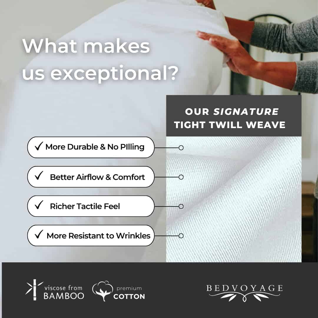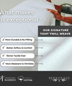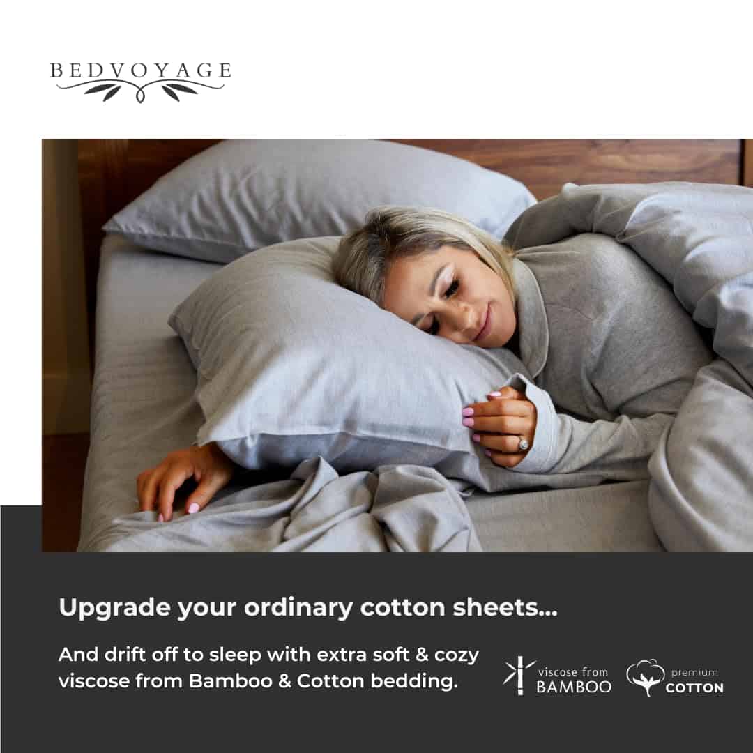 1. Comodidad de Lujo y Frescura: Experimenta las sábanas más suaves con nuestras sábanas de bambú de viscosa de BedVoyage. Disfruta de una noche de sueño fresco y cómoda con una tela transpirable que regula naturalmente la temperatura, elaborada a partir de una mezcla premium de 50% viscosa de bambú y 50% algodón.