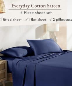 Juego de sábanas King – Juego de 4 piezas de sábanas de cama fabricadas con tejido naturalmente cómodo de algodón satén 100%. Estas suaves y transpirables sábanas y fundas de almohada refrescantes están diseñadas para brindar comodidad duradera durante todo el año. Estas sábanas King tamaño bolsillo profundo no son juegos de sábanas sintéticas o de poliéster mezclado. Estas sábanas King tamaño están hechas con el mejor algodón cultivado en la India y todos nuestros juegos de sábanas y fundas de almohada de algodón son amados por los clientes por su calidad superior, suavidad y comodidad. El juego incluye: 1 sábana plana superior, 1 sábana ajustada con bolsillo profundo de 14″, y 2 fundas de almohada tamaño King. Las fundas de almohada con cierre tipo sobre aseguran un aspecto ordenado. Las sábanas y fundas de almohada de calidad hotelera tienen un elástico todo alrededor en la sábana ajustada y un «indicador de cabecera / piecera» para una experiencia de hacer la cama fácil. Cuidado y soporte de lavado: estas sábanas de cama de algodón tamaño King son fáciles de lavar y secar a máquina y se vuelven más suaves con cada lavado. Estas sábanas de cama de lujo han sido probadas para la contracción, formación de bolitas y solidez del color. Compre sin riesgos, ya que puede devolver este juego de sábanas azul de algodón si no le gustan, incluso si están lavadas. Lo que nos hace confiables: nuestra colección de ropa de cama está certificada como ESTÁNDAR 100 por OEKO-TEX para garantizar que no entren sustancias dañinas en su cama. Utilizamos cajas no plásticas para nuestro embalaje y estamos comprometidos con procesos conscientes y éticos.