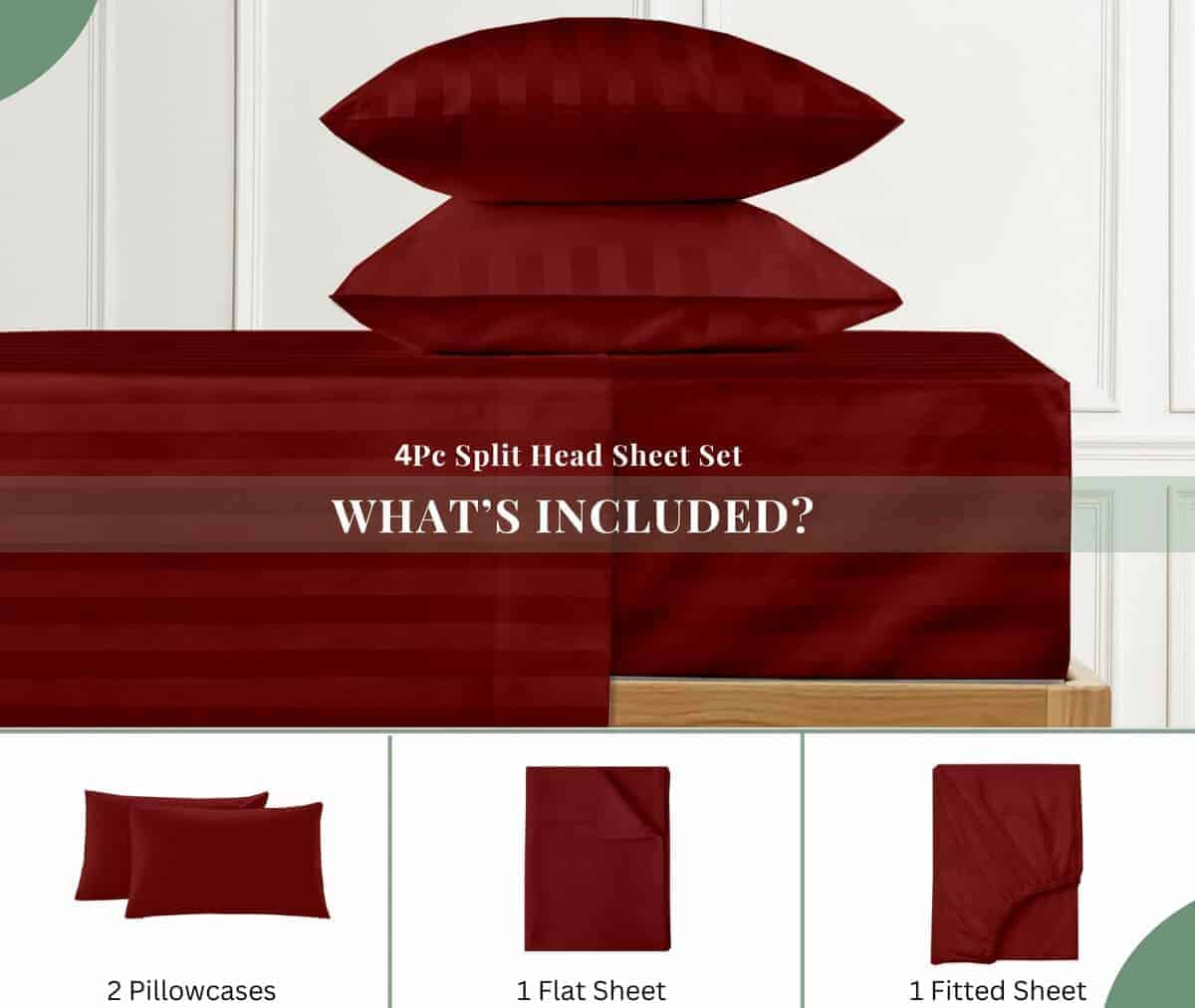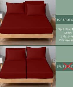 1. Juego de sábanas de cama ajustable Top Split King incluye: Una sábana plana mide 102 pulgadas de ancho x 108 pulgadas de largo, Una sábana ajustable dividida superior de 78 pulgadas de ancho x 80 pulgadas de largo con 6 bolsillos en las esquinas para adaptarse a un colchón de bolsillo profundo de 18 pulgadas y Dos fundas de almohada King que miden 20 pulgadas de ancho x 40 pulgadas de largo cada una. 2. Sábana ajustable superior de Split Top King: Dividida desde 32 pulgadas desde la parte superior. 3. Información del material: Juego de sábanas de cabeza superior dividida 100% algodón egipcio ofrece una combinación buscada de resistencia superior, suavidad lujosa y brillo hermoso. Este juego de sábanas está hecho de puro algodón 100%. 4. Garantía de satisfacción del 100%: Nos comprometemos a asegurarnos de que ames tus nuevas sábanas y tengas una experiencia excepcional. Juego de sábanas que transforma un dormitorio en un oasis, queremos que ames cada noche en nuestra ropa de cama de alta calidad. Dales el regalo definitivo o date un capricho. ORDENA AHORA, sin riesgos. Si no estás completamente satisfecho, avísanos y lo solucionaremos. 5. Instrucciones de cuidado: Lavable a máquina con agua fría, ciclo delicado con detergente suave. No usar lejía, secar este juego de sábanas con la configuración baja.