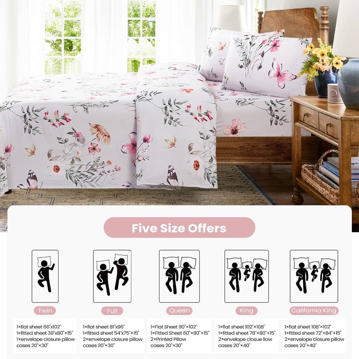 4. Juego de Sábanas King Size 4PCS (1) sábana plana: 102″ 108″, (1) sábana ajustable: 78″ 80″ 15″, (2) funda de almohada: 20″ 40″. Las sábanas ligeras y suaves de color azul con estampado floral son adecuadas para habitaciones de adultos o colchones de hotel.