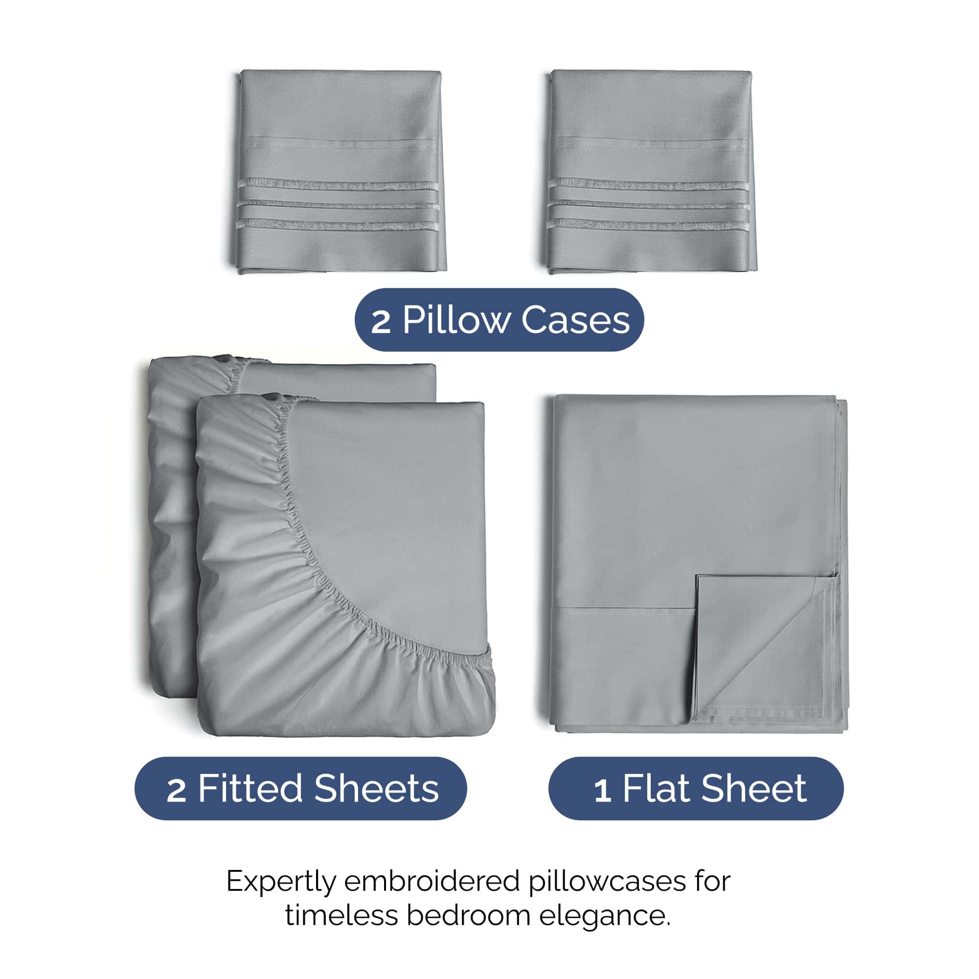 1. JUEGO DE SÁBANAS DE 5 PIEZAS: 2 fundas de almohada, una sábana plana y 2 sábanas ajustables. Sábana plana (108″ x 102″) 2 Sábanas ajustables (39″ x 80″) 2 Fundas de almohada (20 x 40).