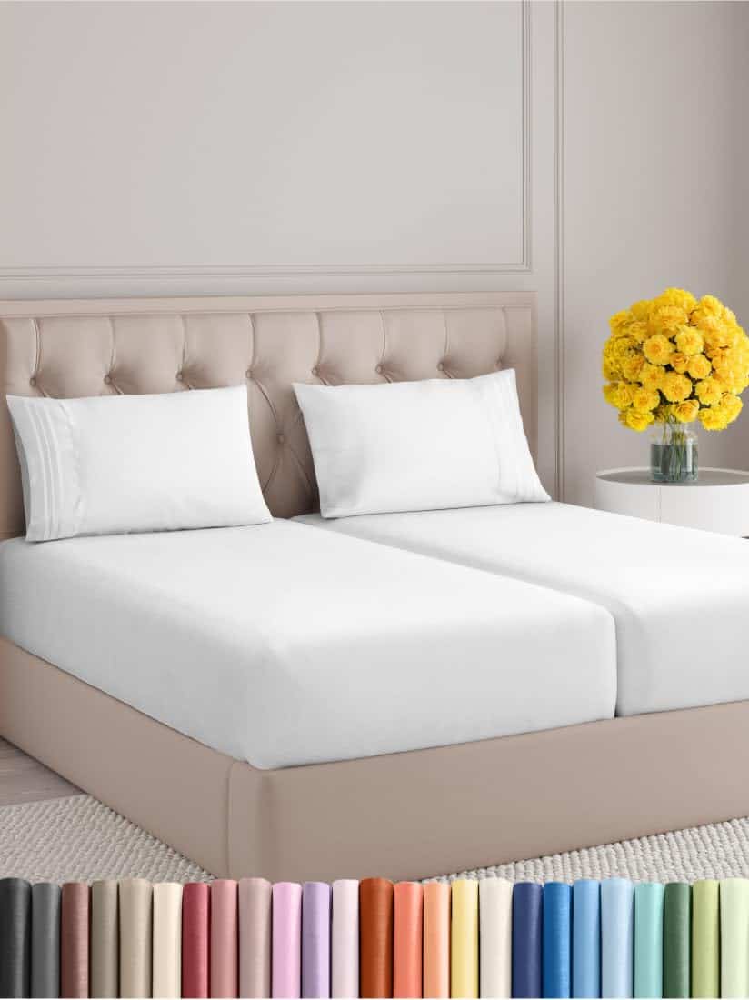 Este juego de sábanas tamaño Split King de 5 piezas proporciona un lujo excepcional y comodidad para su cama. Incluye 2 fundas de almohada, una sábana encimera y 2 sábanas ajustables. La sábana encimera mide 108″ x 102″ y las sábanas ajustables miden 39″ x 80″ cada una. Las 2 fundas de almohada tienen un tamaño de 20″ x 40″ cada una. Con bolsillos profundos y ajuste fácil, estas sábanas se adaptan a colchones de hasta 16 pulgadas de profundidad. Hechas de microfibra cepillada de la más alta calidad, estas sábanas son suaves, transpirables y frescas, brindando una comodidad superior. Son más suaves que las sábanas de algodón egipcio y orgánico. Ideales para cualquier habitación de su casa, ya sea el dormitorio, habitación de invitados, RV u hogar de vacaciones. Estas sábanas blancas brillantes son un gran regalo para cualquier persona. Además, ofrecen una excelente relación calidad-precio, siendo algunas de las sábanas más suaves y asequibles que encontrará en el mercado. Disfrute de la sensación lujosa y la comodidad de las sábanas CGK Unlimited.