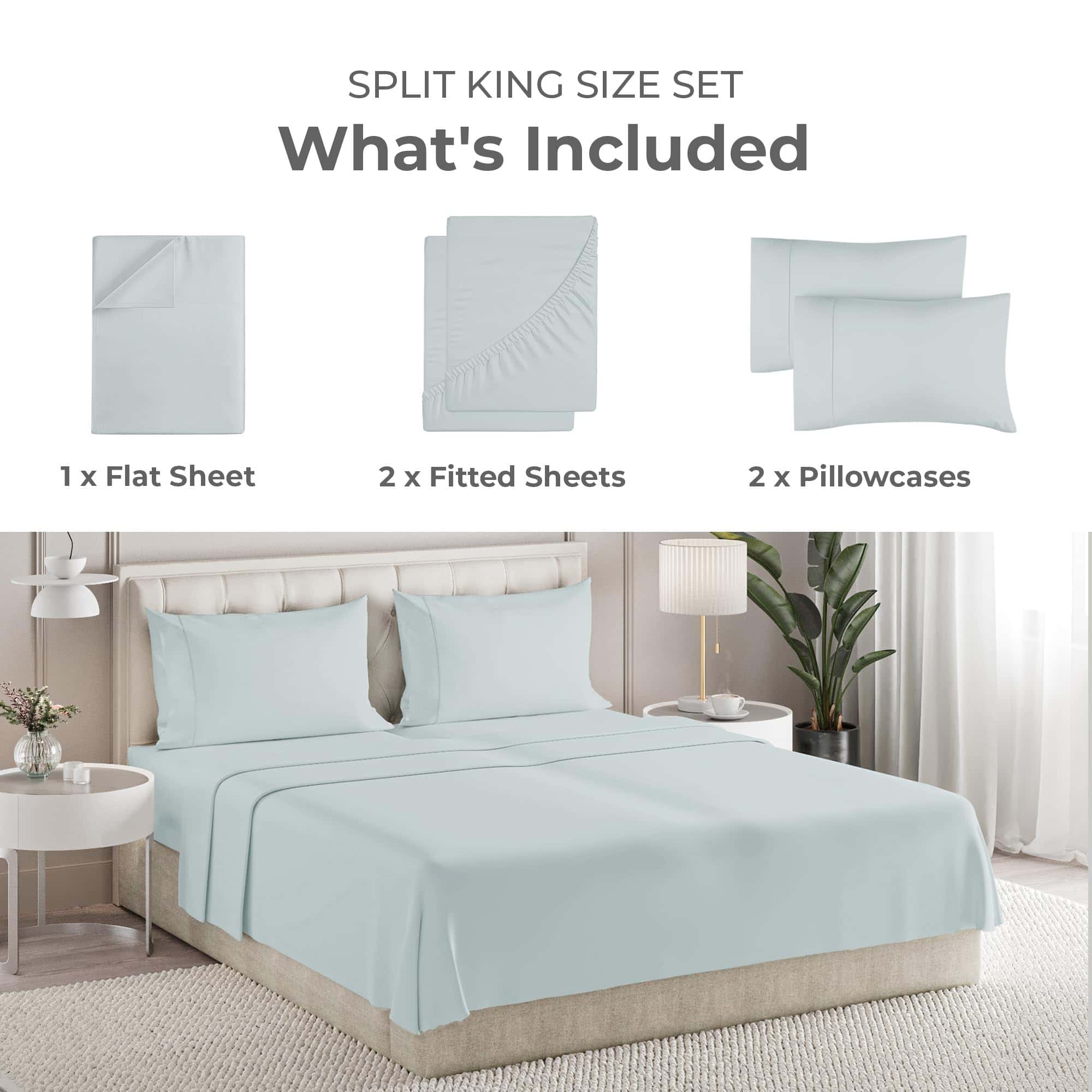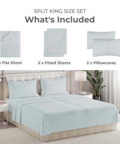 Juego de sábanas tamaño Split King de Sleepy Town – 5 piezas – Juego de sábanas Split King – Extra suaves, cómodas y frescas – Fácil cuidado – Sin encogimiento, arrugas ni decoloración – Microfibra cepillada – Sábanas de bolsillo profundo (Azul hielo) – Este juego completo de sábanas tamaño Split King incluye 1 sábana plana, 2 sábanas ajustables y 2 fundas de almohada. Frescas, cómodas y muy acogedoras; disfrute de la experiencia de sueño definitiva con el juego de sábanas de 5 piezas de Sleepy Town. Hechas de microfibra cepillada extra suave, asegurando un tacto excepcionalmente suave y sedoso. Duerma plácidamente y disfrute de una noche de sueño cómoda, lavado tras lavado. Dile hola a la facilidad de nuestros juegos de sábanas resistentes a arrugas y encogimiento para obtener sábanas súper suaves que lucen tan bien como se sienten. Nuestro tratamiento especial de retención del color evita la decoloración para mantener los colores vibrantes y frescos. ¡Sus sábanas seguirán viéndose y sintiéndose como nuevas, preservando su estética y comodidad! Nuestro versátil juego de sábanas tamaño Split King te ayuda a mantenerte fresco y cómodo durante las noches calurosas de verano y acogedor durante los fríos meses de invierno. Las sábanas certificadas por OEKO Tex ofrecen una opción sostenible que no compromete la comodidad ni el valor. Hechas sin el uso de químicos agresivos; despierte renovado sabiendo que sus sábanas son tan suaves con el planeta como lo son con usted. Diseñadas para un cuidado sin problemas, estas sábanas permanecen en excelente condición sin esfuerzos adicionales, haciéndolas ideales para hogares ocupados. Diseñadas para aquellos que valoran la comodidad premium sin la etiqueta de precio premium, las sábanas de Sleepy Town están pensadas y hechas con SU comodidad (y asequibilidad) en mente. ¡Nuestras sábanas son un testimonio de nuestro compromiso con un sueño de calidad y sábanas cómodas para todos!