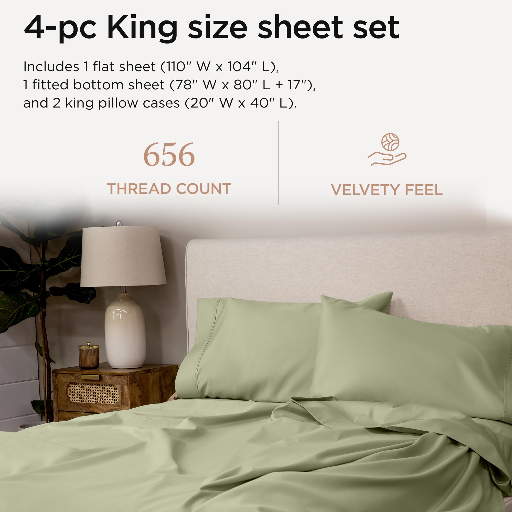 Threadmill American Supima King Size Sheets Set | 656 Thread Count 4 Piece Luxury Bed Sheets for King Size Mattress | 5 Star Hotel Quality Sheets with Elasticized Extra Deep Pocket | Sage Green Sheets