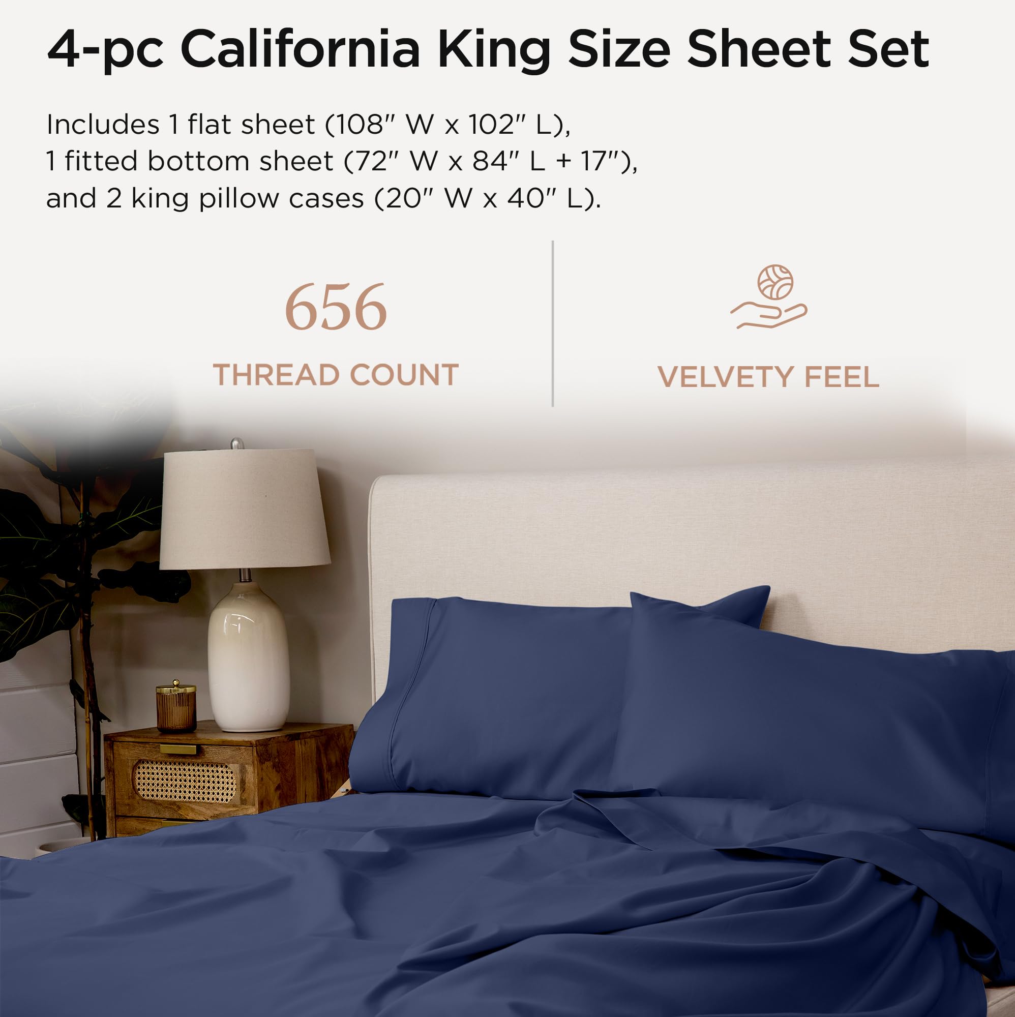 Threadmill California King Sheet Sets | Certified American Supima Cotton Sheets | 656 Thread Count 4 Piece Hotel Quality Luxury Bed Sheets Set with Elasticized Extra Deep Pocket | Folkstone Blue Sheets
