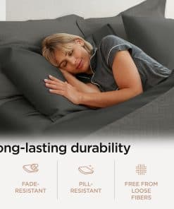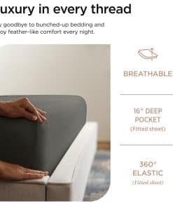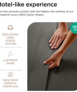 Lujoso juego de sábanas Threadmill Luxury con 800 hilos de algodón, tamaño King. Este juego de cama incluye una sábana plana de 110″ de ancho por 104″ de largo, una sábana ajustable de 78″ de ancho por 80″ de largo con un bolsillo profundo de 16″, y dos fundas de almohada King de 20″ de ancho por 40″ de largo. Las sábanas están tejidas con hilos de algodón extra largo para ofrecer una suavidad y comodidad excepcionales. El tejido de satén aporta un brillo lustroso y una elegancia similar a la de un hotel. Con sus 800 hilos por pulgada, estas sábanas son duraderas y transpirables, lo que las hace ideales para quienes duermen calientes. La sábana bajera elástica de bolsillo profundo permite un ajuste perfecto y evita que las sábanas se muevan mientras duermes. Además, las sábanas se fabrican con una artesanía superior que garantiza que no se formen bolitas y que mantengan su resistencia a lo largo del tiempo. Para el cuidado de estas sábanas, se recomienda lavarlas a máquina a temperatura ambiente, secarlas a baja temperatura y doblarlas inmediatamente después para evitar la contracción y las arrugas. Este juego de sábanas es la elección perfecta para regalar, ya que complementa cualquier decoración de dormitorio. Con su suavidad y colores perfectamente combinados, estas sábanas brindarán una sensación acogedora al deslizarte entre ellas. Además, estos productos están fabricados con prácticas certificadas y sostenibles, sin productos químicos dañinos, y cuentan con una garantía de satisfacción del 100%. Disfruta de la experiencia de lujo y comodidad con este juego de sábanas Threadmill Luxury de 800 hilos de algodón.