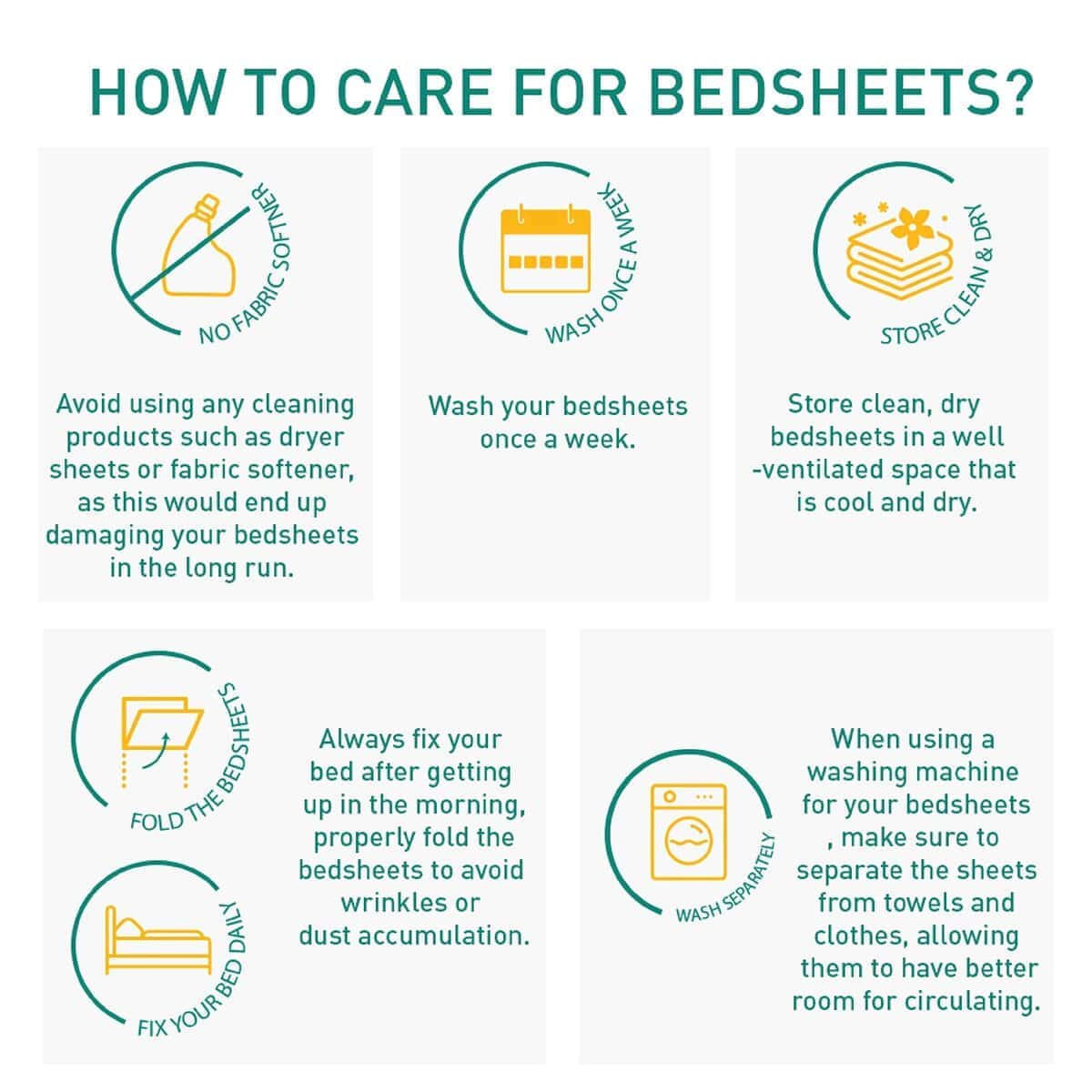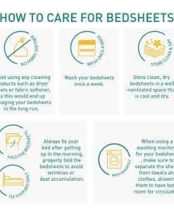 4. Cuidado fácil – Puede lavar a mano estas sábanas de algodón y secar a la sombra. También, lavar a máquina es una opción adecuada, pero con agua tibia para reducir las arrugas. Pueden secarse en secadora a baja temperatura. Se recomienda no usar lejía ni lavar en seco el producto. Además, recuerde lavar los colores oscuros por separado.