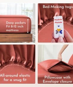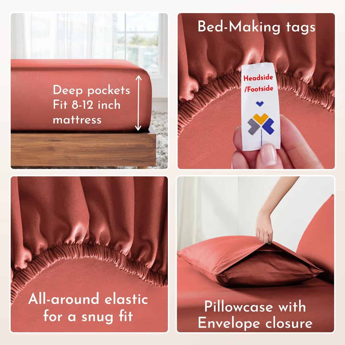 3. Lo que incluye este juego de sábanas twin de 3 piezas: 1 sábana plana superior (66″ W x 100″ L), 1 sábana ajustable inferior (39″ W x 75″ L) con bolsillo de 12″ de profundidad, y 1 funda de almohada de tamaño estándar (21″ W x 27″ L). La funda de almohada con cierre de sobre garantiza un aspecto ordenado. Nuestra sábana ajustable inferior tiene un elástico en todo el contorno y un indicador de «lado de la cabecera/pie» para una experiencia fácil al hacer la cama.