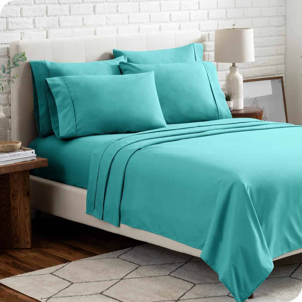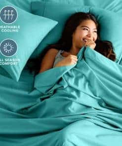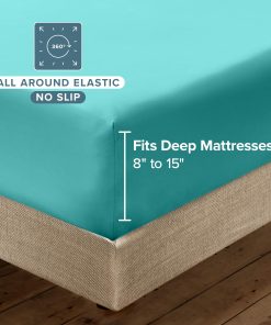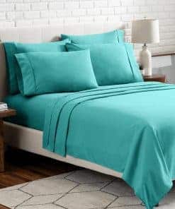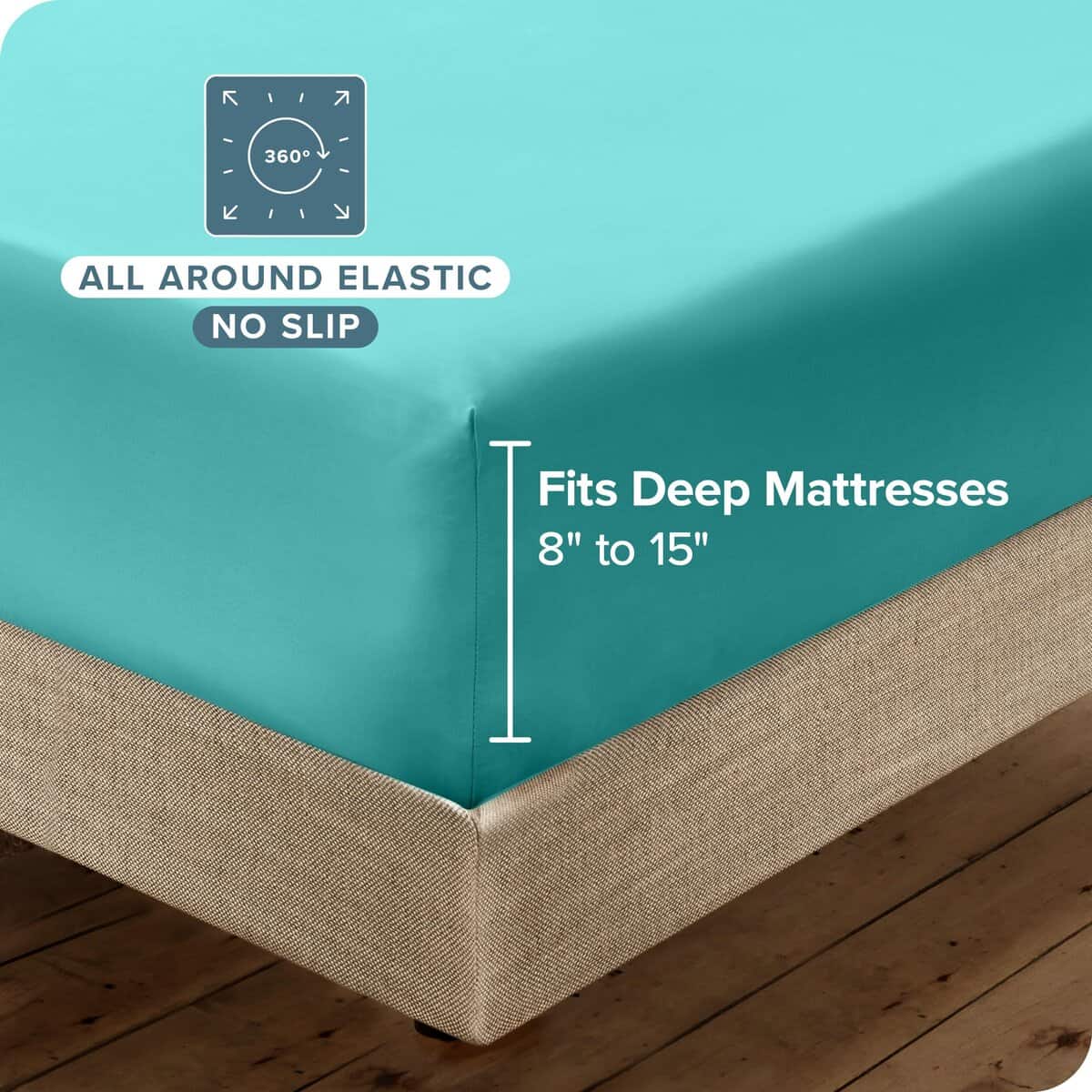 Bare Home ofrece un juego de sábanas de lujo para hotel que proporcionan una comodidad incomparable en tu cama. Este juego de 4 piezas incluye una sábana plana Twin XL, una sábana ajustable Twin XL y 2 fundas de almohada estándar. Las sábanas son de color turquesa y tienen un bolsillo profundo que se adapta a colchones de hasta 15 pulgadas de profundidad. El elástico alrededor garantiza un ajuste firme para mantener todo en su lugar durante la noche. Hechas de microfibra exclusiva hidrocepillada, estas sábanas son más suaves y resistentes que las sábanas de algodón estándar.