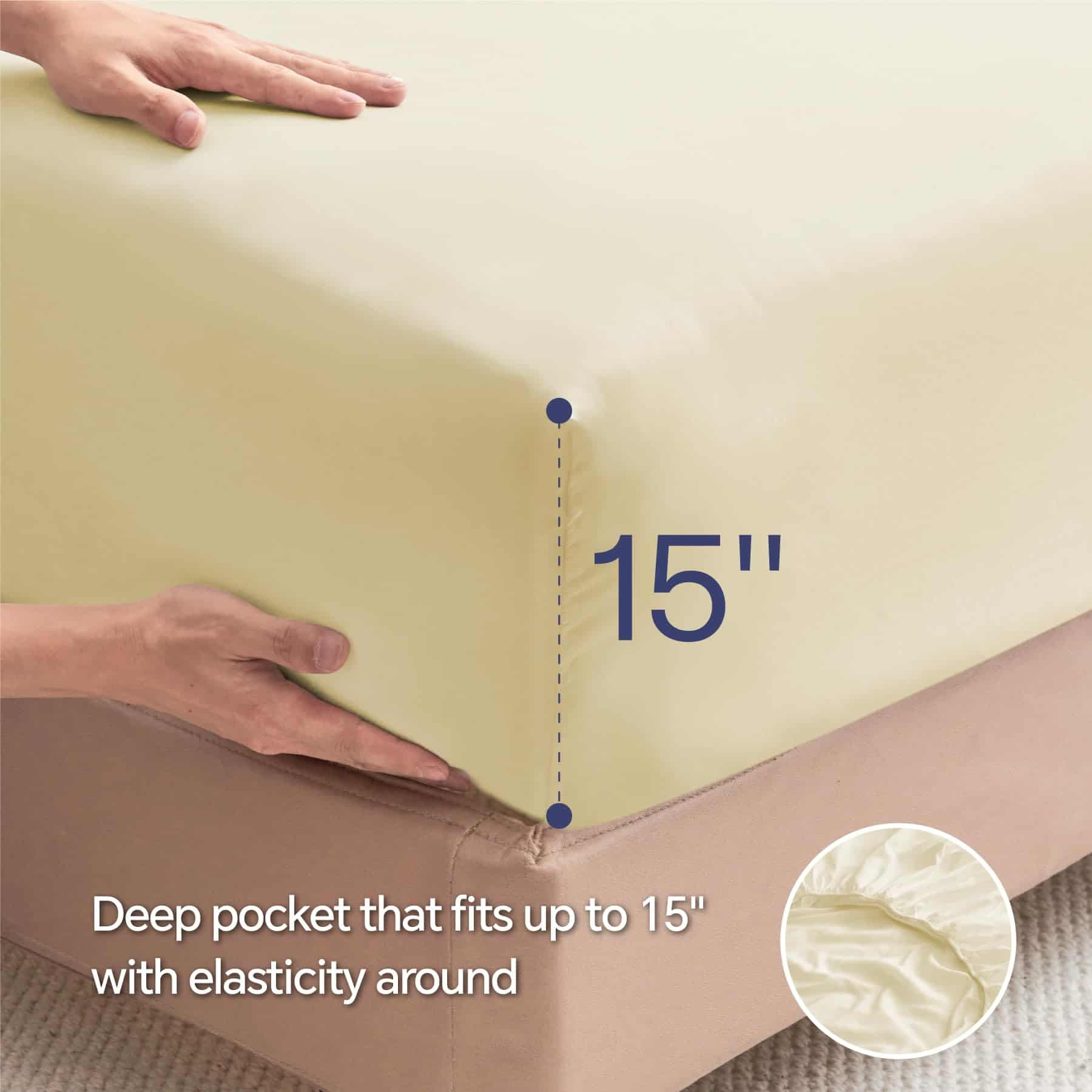 3. Bolsillo Profundo y Ajuste Fácil: El diseño especial de bolsillo profundo puede adaptarse a colchones de hasta 15 pulgadas de grosor. Ya no tendrás que preocuparte por que se resbalen tus sábanas, nuestros productos se ajustan perfectamente y se mantienen firmes. La banda elástica alrededor del borde garantiza un ajuste seguro que no se moverá mientras duermes.