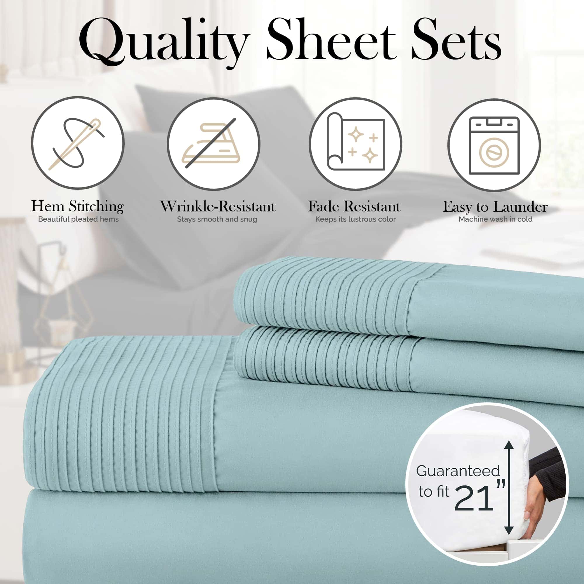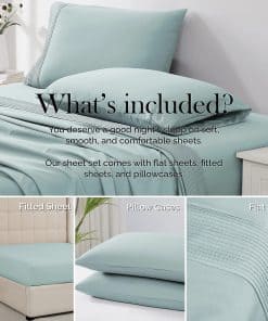 3. Lo que obtendrás: Los juegos de sábanas y fundas de almohada de 3 piezas incluyen una (1) sábana ajustable de bolsillo extra profundo totalmente elástica (39″ x 80″ x 21″ de profundidad), una (1) sábana plana (66″ x 96″) y una (1) funda de almohada estándar (20″ x 30″) con un borde plisado hermoso.