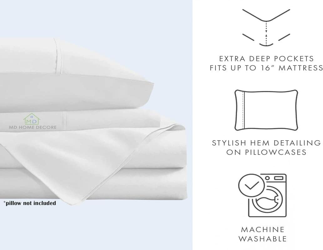 ! Acerca de MD Home Decore ! Los productos de MD Home Decore están diseñados para apoyar su cuerpo para un descanso nocturno saludable y nuestros productos para la cama están diseñados para maximizar su comodidad y lujo para una experiencia de sueño perfecta. Sábanas de algodón egipcioEl algodón egipcio se recolecta a mano, lo que reduce el estrés en las fibras, dejándolas rectas e intactas. Estas fibras pueden alargarse para crear hilos muy finos que permiten hacer hilos sin sacrificar la longitud, dando como resultado un algodón más resistente y suave, a diferencia del algodón regular que tiene más empalmes. Ahora puede comprar cómodas sábanas de lujo en un solo paquete en lugar de comprar cada artículo por separado. A menudo es ventajoso comprar un juego de sábanas en lugar de comprar todo por separado. Este juego de sábanas incluye 1 sábana ajustable, 1 sábana plana y 2 fundas de almohada. Tamaño disponible- Twin, Twin XL, Full, Full XL, Queen, Short Queen, King, California King, RV King, Split Queen, Split King, Top Split King-34″, Cot-30″ x 75″ y Cot-33″ x 75″Color sólido/listado disponible- Blanco, Marfil, Taupe, Gris oscuro, Gris claro, Azul claro, Azul marino, Chocolate, Salvia, Estampado de leopardo, Estampado de cebra, etc. Producto disponible- Juego de sábanas, Juego de funda nórdica, Sábana ajustable, Sábana plana, Fundas de almohada, Edredón, Cubierta de edredón, Falda de cama. Misión es marcar la diferencia en el sueño y la salud de los clientes de MD Home Decore a través de la elaboración a mano de productos de ropa de cama de la más alta calidad. Con un legado familiar en el campo de la fabricación de colchones, nuestra pasión inicial fue proporcionar una variedad de productos