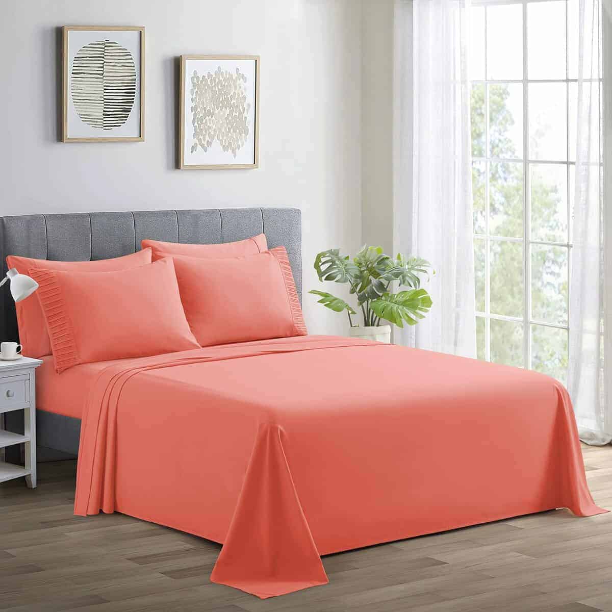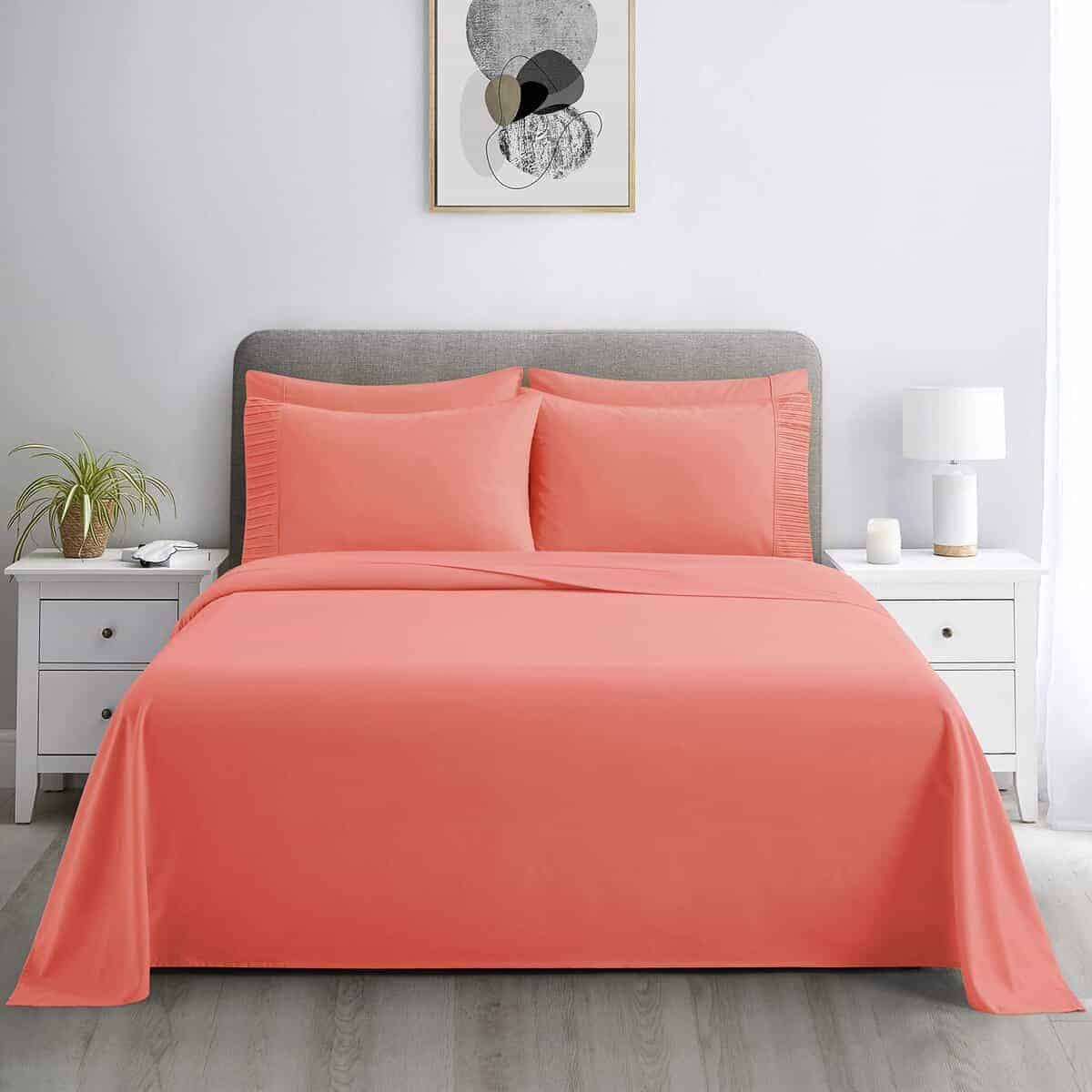 3. Material del contenido – 85% poliéster y 15% rayón de bambú. El juego de sábanas está hecho de poliéster de doble cepillado de trama ultra fina y rayón de bambú que ofrece una sensación super suave y resistente a las arrugas.