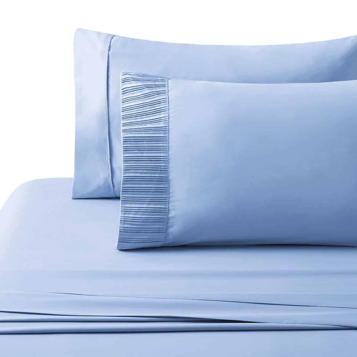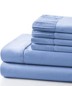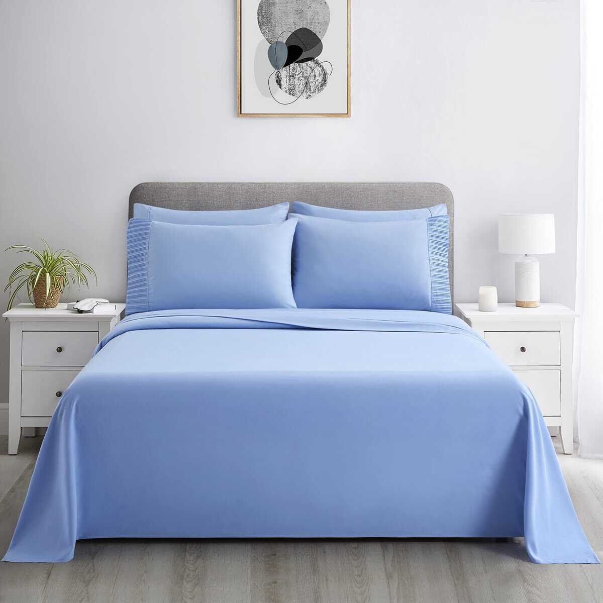 1. Diseño – Ropa de cama con diseño plisado en los extremos de las 2 fundas de almohada. Nuestro poliéster doble cepillado de 120 GSM y rayón de bambú es suave y duradero, con una tejido transpirable. 2. Tamaño y Dimensiones – Este juego de cama para cama doble/completa incluye 1 sábana plana de 81 x 96 pulgadas, 1 sábana ajustable de 54 x 75 + 15 pulgadas, 2 fundas de almohada plisadas de 20 x 30 pulgadas y 2 fundas de almohada lisas de 20 x 30 pulgadas. 3. Material de Contenido – 85% Poliéster y 15% Rayón de Bambú. El juego de sábanas está hecho de un tejido ultraligero de poliéster doble cepillado y rayón de bambú, con una sensación súper suave y resistente a las arrugas. 4. Característica – La sábana ajustable de bolsillos profundos está completamente elástica para un ajuste de hasta 16 pulgadas. Duradero, sin formación de bolitas, súper suave, resistente a las arrugas, prelavado, resistente a la decoloración, hipoalergénico, transpirable. Hermosamente empaquetado en una bolsa con cremallera. 5. Instrucciones de Cuidado Fáciles – Lavable a máquina con agua fría. Lavar por separado blancos y colores. No utilizar lejía con colores. Secar a baja temperatura.