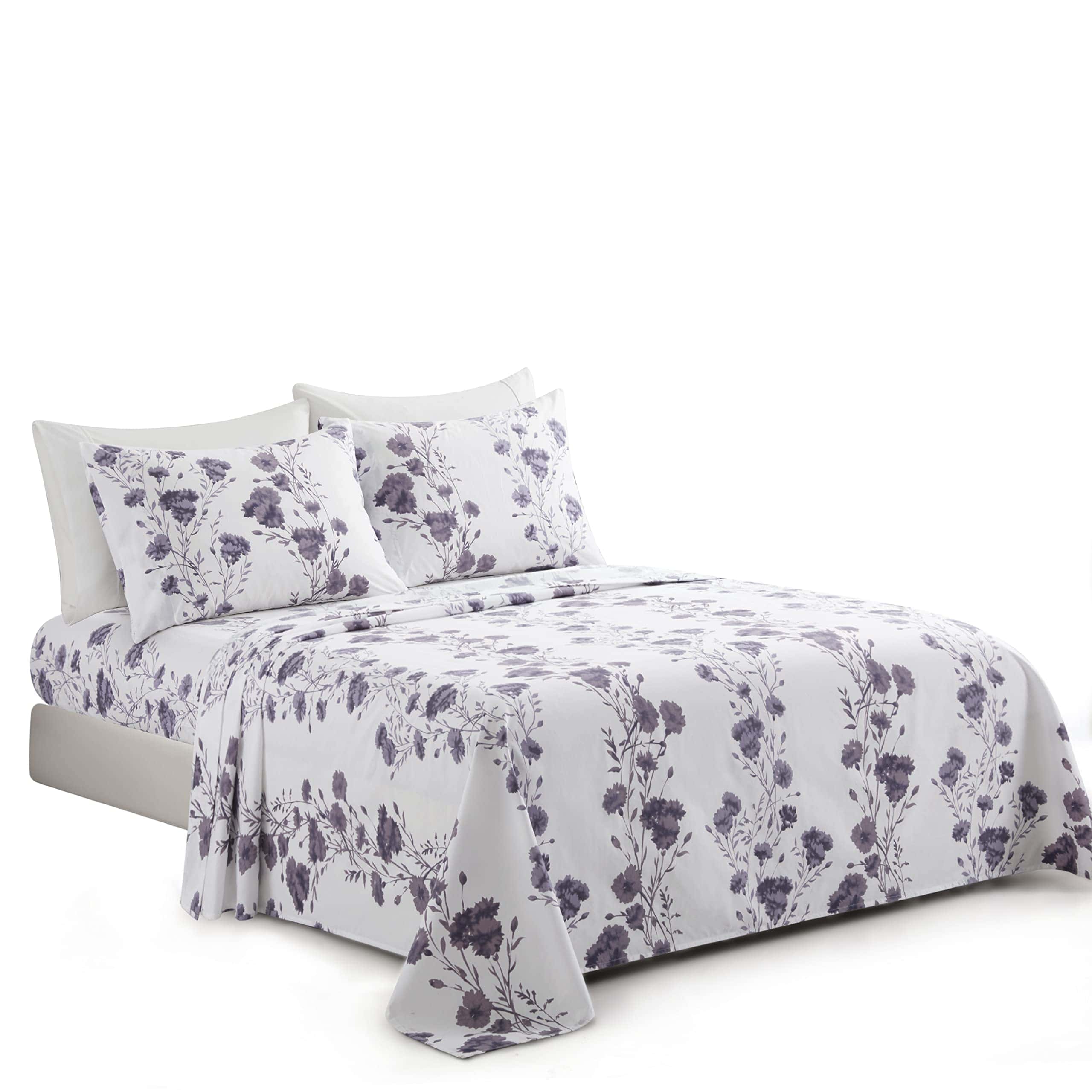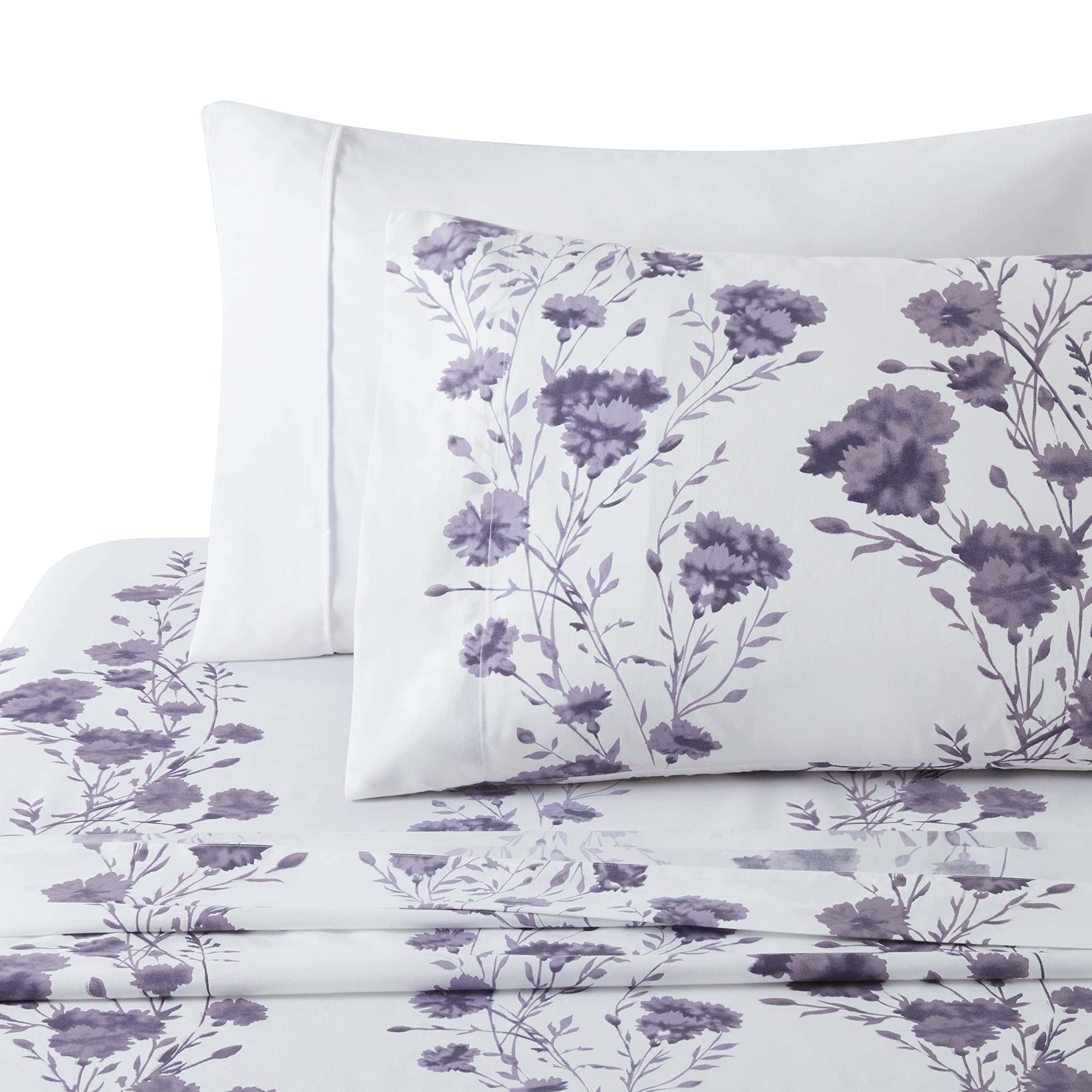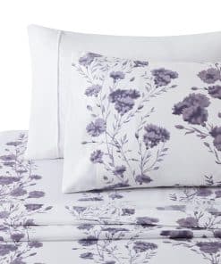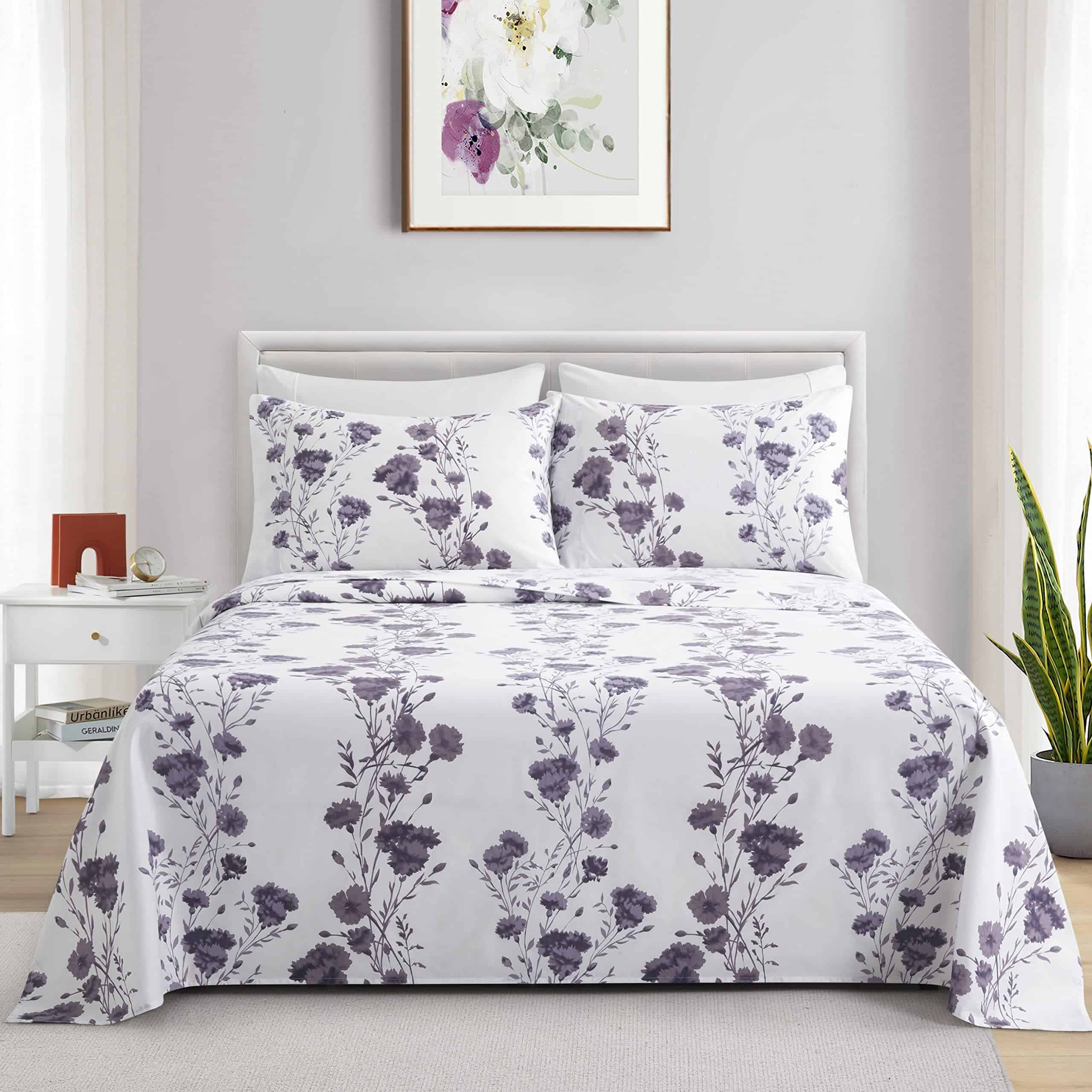 1. Diseño: Este moderno patrón de flores tiene una base blanca con ramas de hojas de clavel púrpura decoradas en él. Diseño impreso a juego en las 2 fundas de almohada. Nuestro poliéster de doble cepillado de 120 GSM y derivado de rayón de bambú es suave y duradero, y cuenta con una tela transpirable.