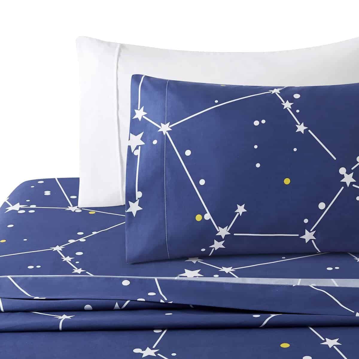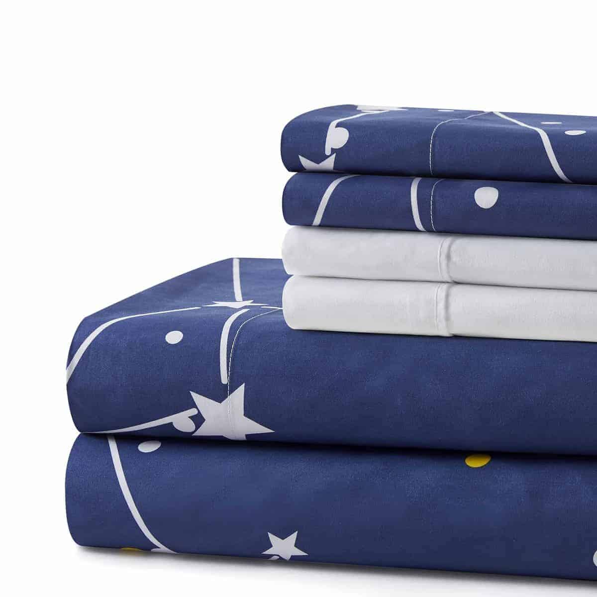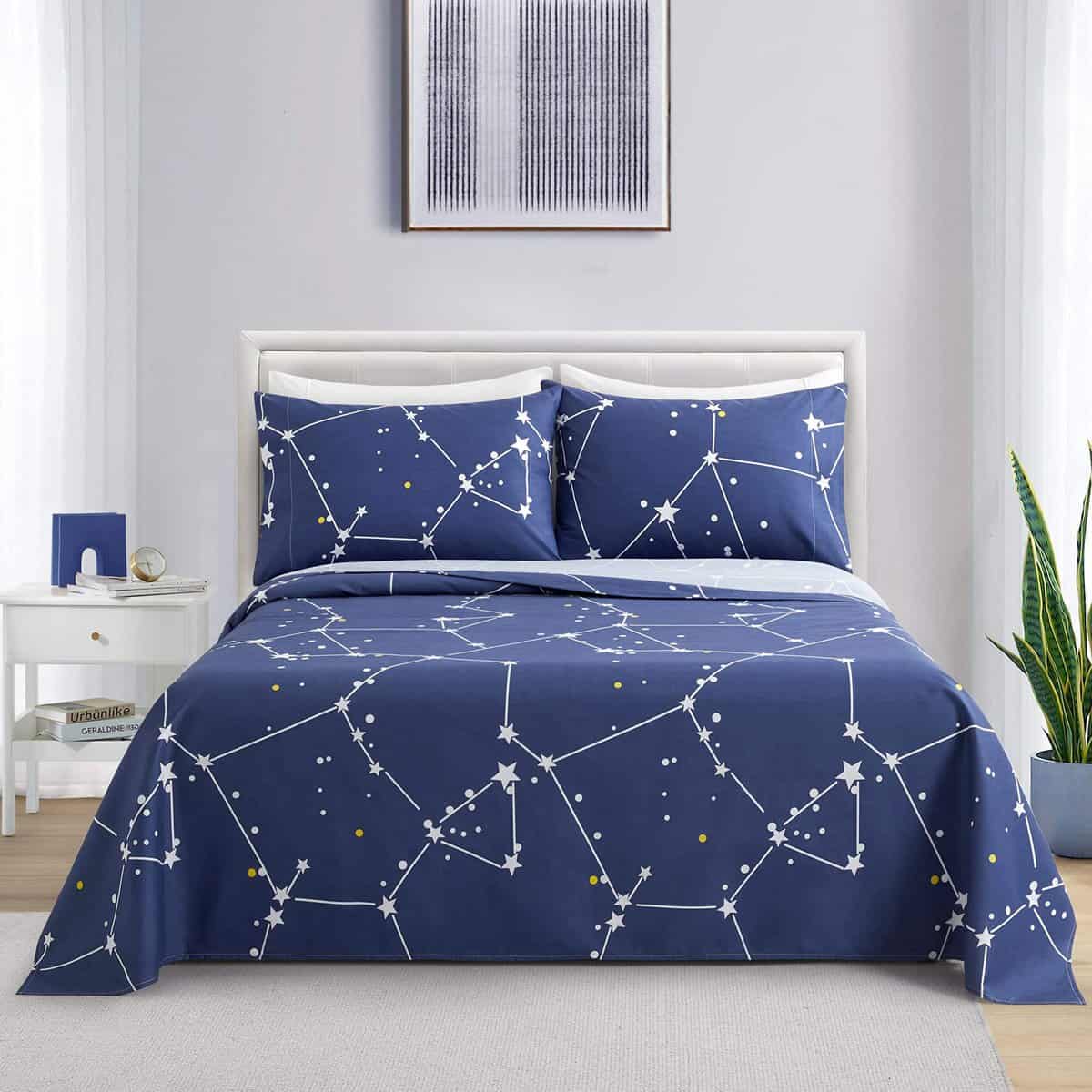 1. Diseño: Este moderno juego de sábanas con patrones de universo galáctico tiene una base azul marino con estrellas blancas y amarillas estilo asterismo decoradas en ella. Diseño impreso a juego en las 2 fundas de almohada. Nuestra mezcla de poliéster de 120 GSM y rayón derivado del bambú es suave y duradera, y cuenta con un tejido transpirable.
