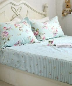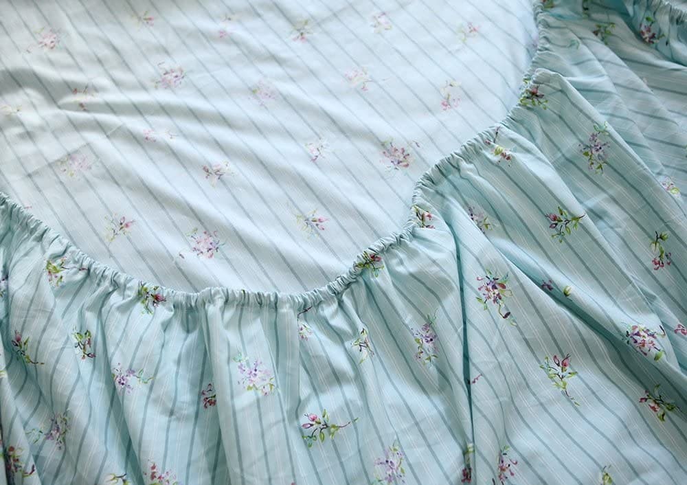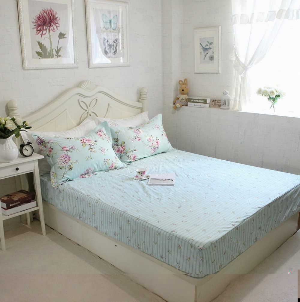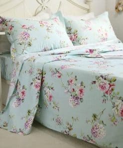 El juego de sábanas de algodón Estampado Floral 100% es una opción encantadora para cualquier tipo de dormitorio. La elegante combinación de rosas y hortensias lila dispersas sobre un fondo verde azulado aporta un estilo campestre y pacífico. ¡Simple pero elegante, ideal para combinar con cualquier decoración del hogar! Está diseñado con un bolsillo profundo elástico alrededor (no solo en las esquinas) que se ajusta a la mayoría de los colchones. Muy adecuado como regalo para amigas, niñas, mamás, en San Valentín, el Día de la Madre y Navidad. ¡Garantía de Satisfacción! Si por alguna razón no estás satisfecho, contáctanos para un reembolso sin complicaciones. Nuestra garantía de devolución de dinero significa que puedes probar nuestro juego de sábanas sin riesgos.