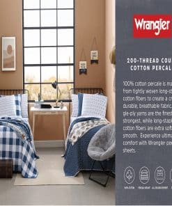 Te presentamos la nueva Colección de Sábanas de Algodón Percale Wrangler, creadas pensando en ti. Elaboradas con algodón de 200 hilos, el tejido percal se siente fresco y agradable al tacto, ideal para quienes duermen ‘calientes’. Disponibles en una variedad de elegantes patrones, los juegos de sábanas Wrangler son ideales para usar durante todo el año y se vuelven más suaves con cada lavado. La sábana ajustable incluida cuenta con elástico en todo su contorno para asegurar que permanezca en su lugar durante la noche. Fabricadas de manera cuidadosa y sostenible utilizando tintes no tóxicos, con certificación oeko-tex. Completa el look en tu dormitorio con edredones, colchas y accesorios de Wrangler, ¡cada uno vendido por separado!