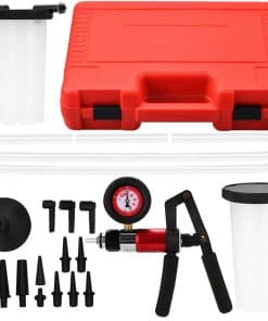 El Juego de Sangrador de Frenos de 23 Piezas con Bomba de Vacío Manual es perfecto para realizar el mantenimiento de los frenos de tu automóvil de manera eficiente y sin complicaciones. Con su amplia gama de 13 adaptadores y tubos, podrás trabajar en cualquier vehículo con facilidad. La bomba de vacío manual de alta presión te permite purgar los frenos de forma sencilla y precisa. Además, su mango ergonómico acolchado y el medidor de vacío integrado hacen que la operación sea cómoda y efectiva. Fabricado con materiales de alta calidad, este juego viene en un resistente estuche de transporte para que puedas almacenarlo de manera segura y transportarlo sin problemas. No pierdas la oportunidad de mantener tus frenos en óptimas condiciones con este completo y práctico kit de sangrado de frenos.
