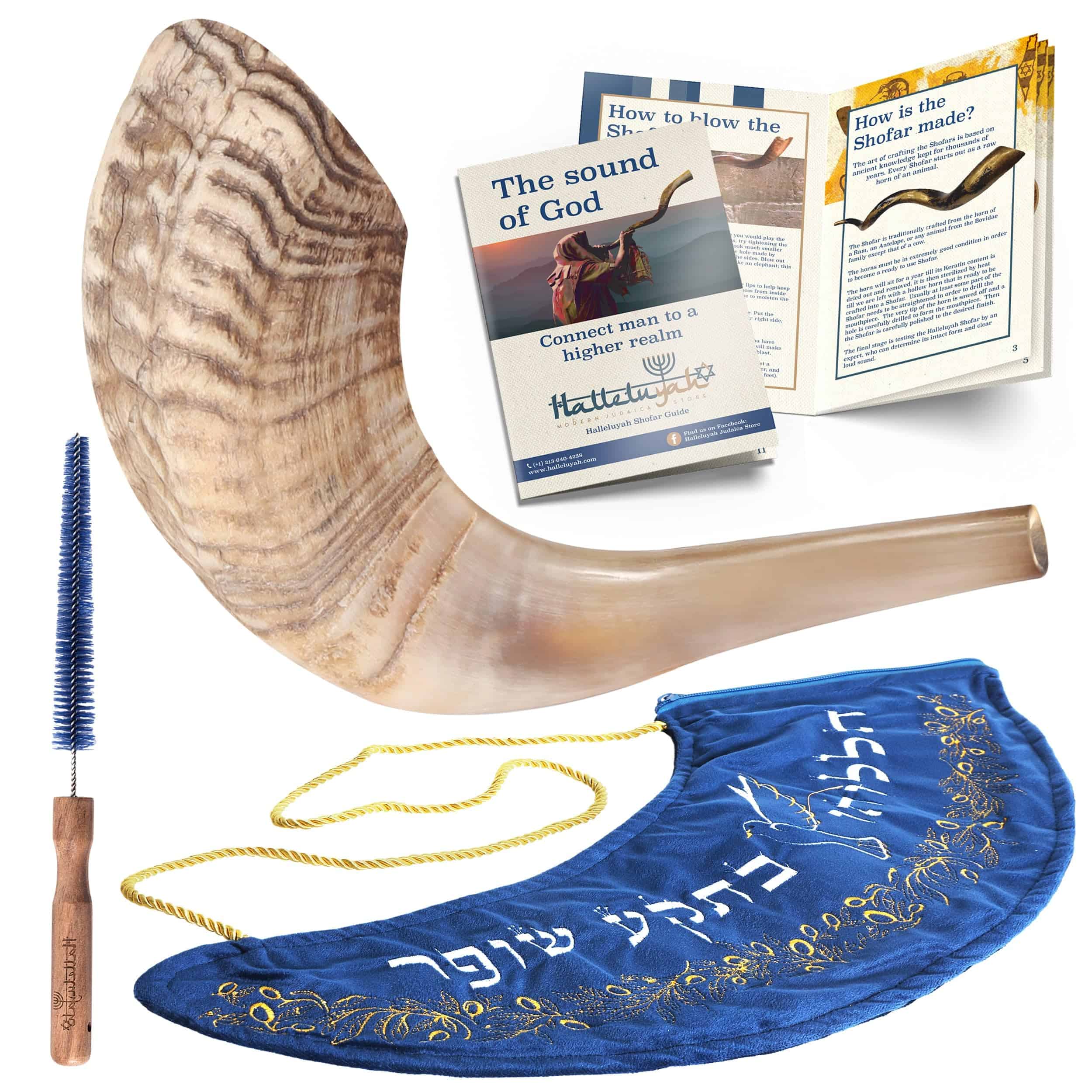 4. Set Completo, Cuidadosamente Curado: Este set incluye un shofar de cuerno de carnero elaborado a mano, una guía detallada de soplado para dominar su uso, un cepillo de limpieza personalizado para cuidado y una bolsa de terciopelo para transporte conveniente. Cada accesorio está diseñado para honrar y mejorar la experiencia de este instrumento sagrado.