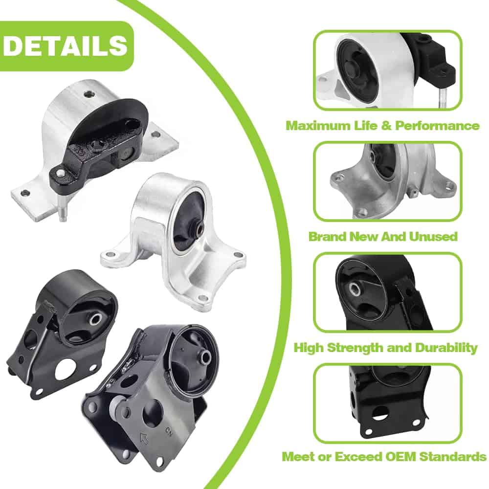 4. Rendimiento confiable: Nuestro juego de soportes de motor y transmisión cuenta con una construcción robusta para minimizar la vibración y mantener la alineación adecuada del motor. Perfecto para reemplazar soportes de motor automotriz, estos soportes brindan experiencias de conducción suaves y estables.