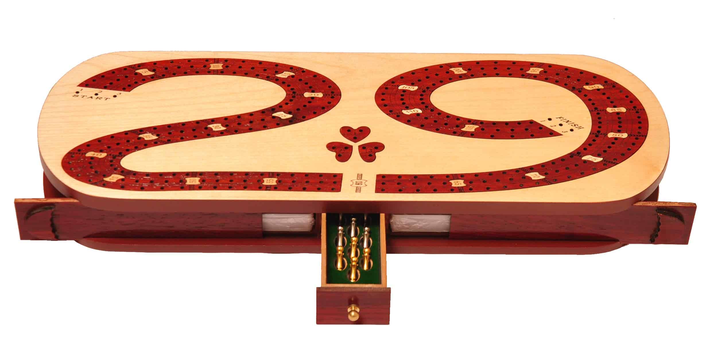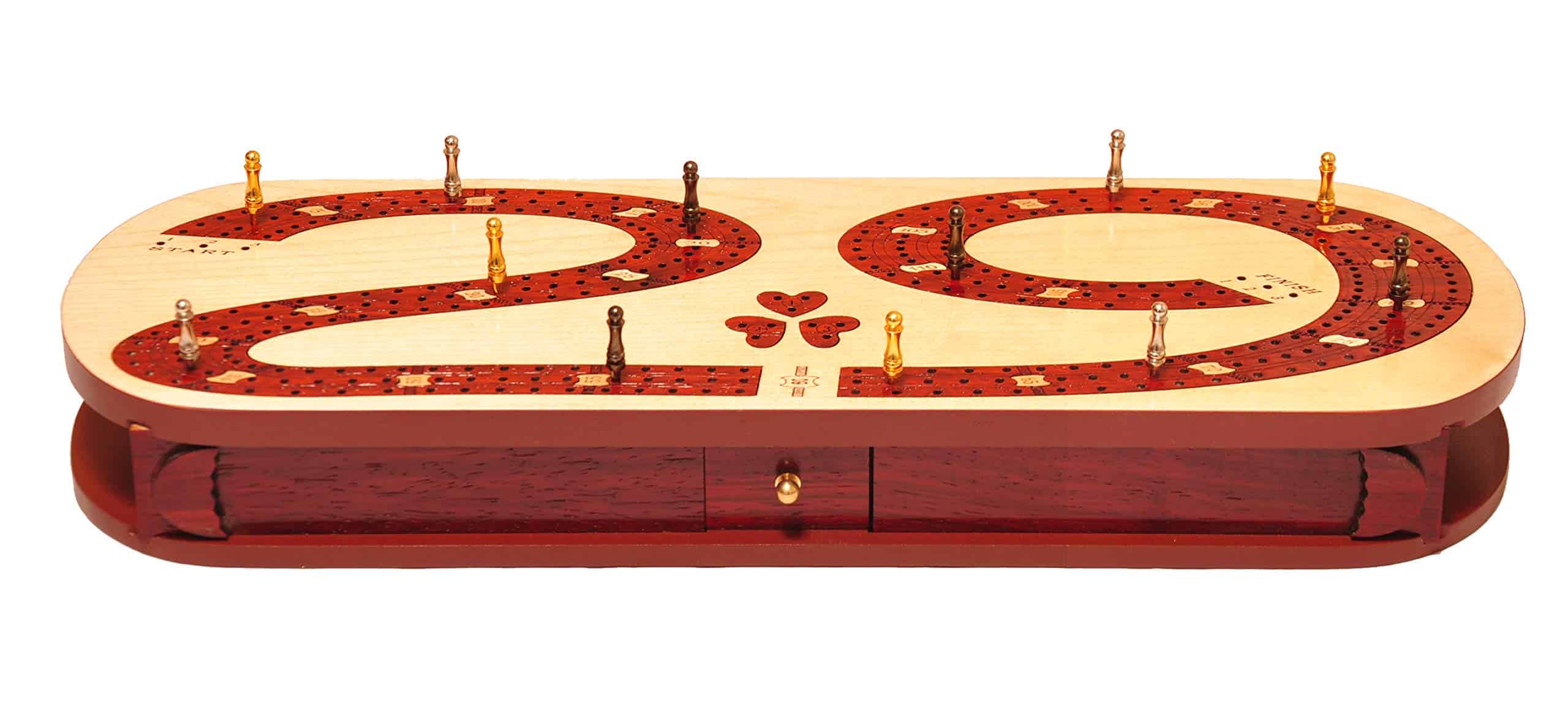 Palm Royal Handicrafts presenta tablero de cribbage continuo de 3 pistas (120 casas) para hasta 3 jugadores. Forma numérica 29 con pistas de madera de sangre y arce. Ambos lados del tablero tienen formas semicirculares para un mejor agarre. Cierre magnético en los deslizadores. Las clavijas son doradas, plateadas y negras para tableros de 4 pistas y 3 pistas. Tamaño del tablero 15 x 5.2 x 2 pulgadas. Sobre el juego: Cribbage es un juego de cartas tradicionalmente para dos jugadores, pero comúnmente jugado con tres, cuatro o más. Incluye grupos de cartas que obtienen puntos, tablero de cribbage, crib y sistema de puntuación único.