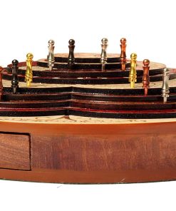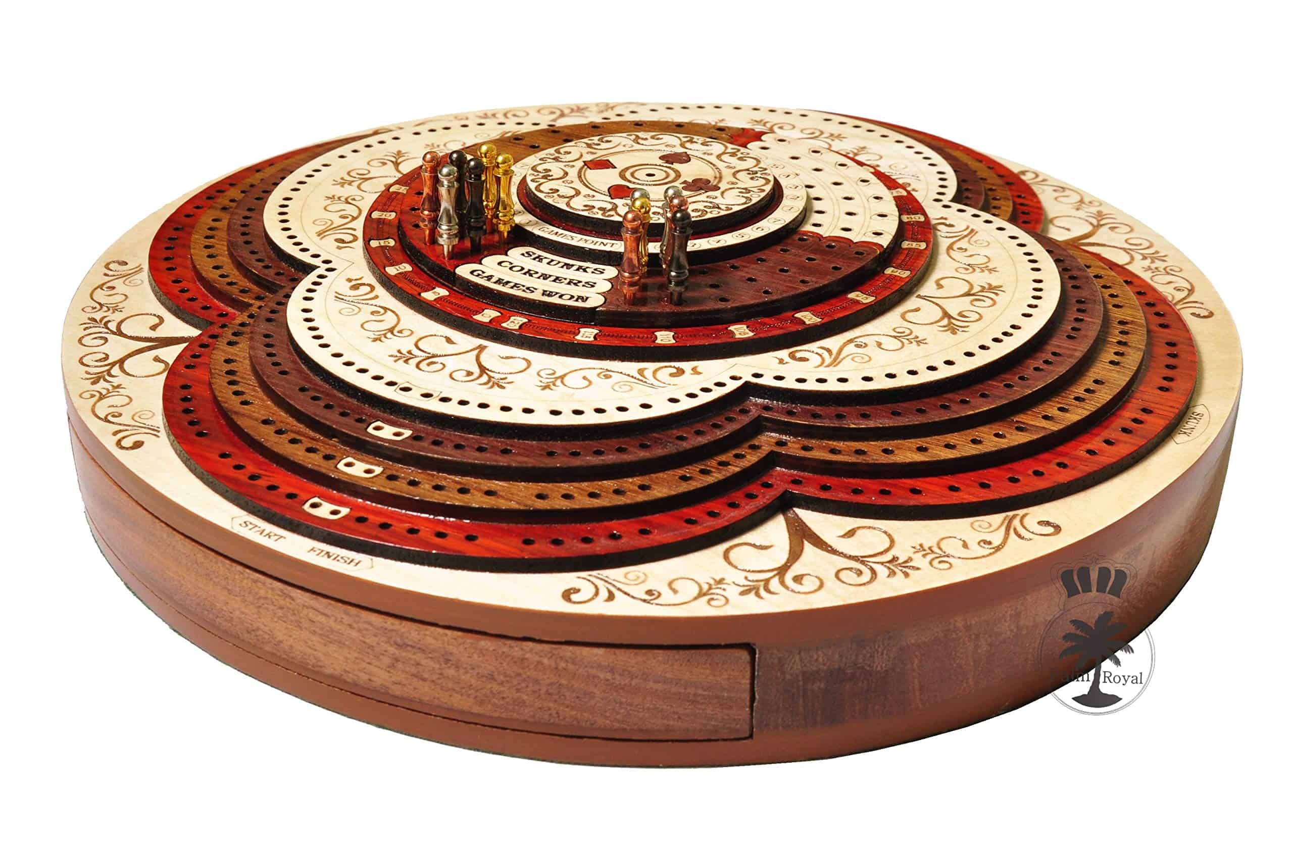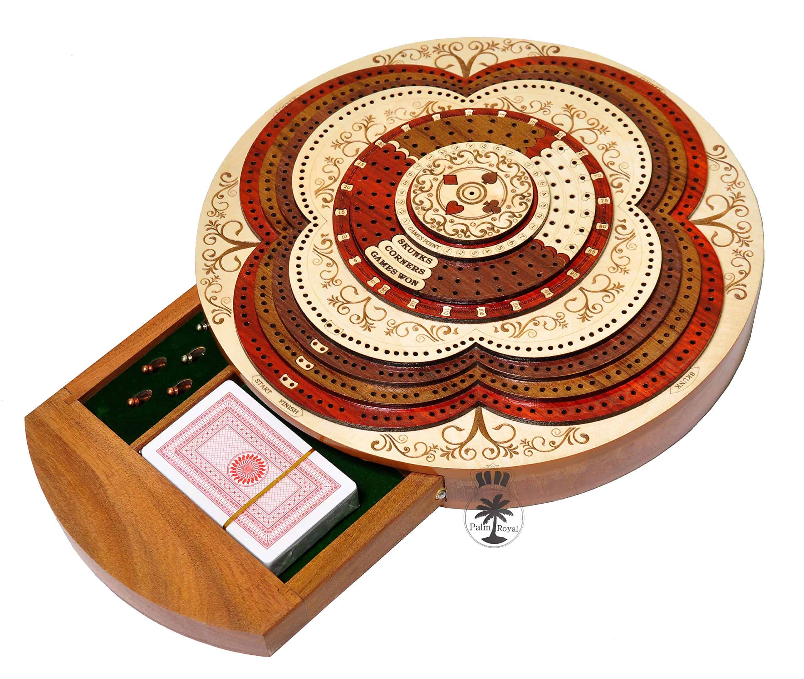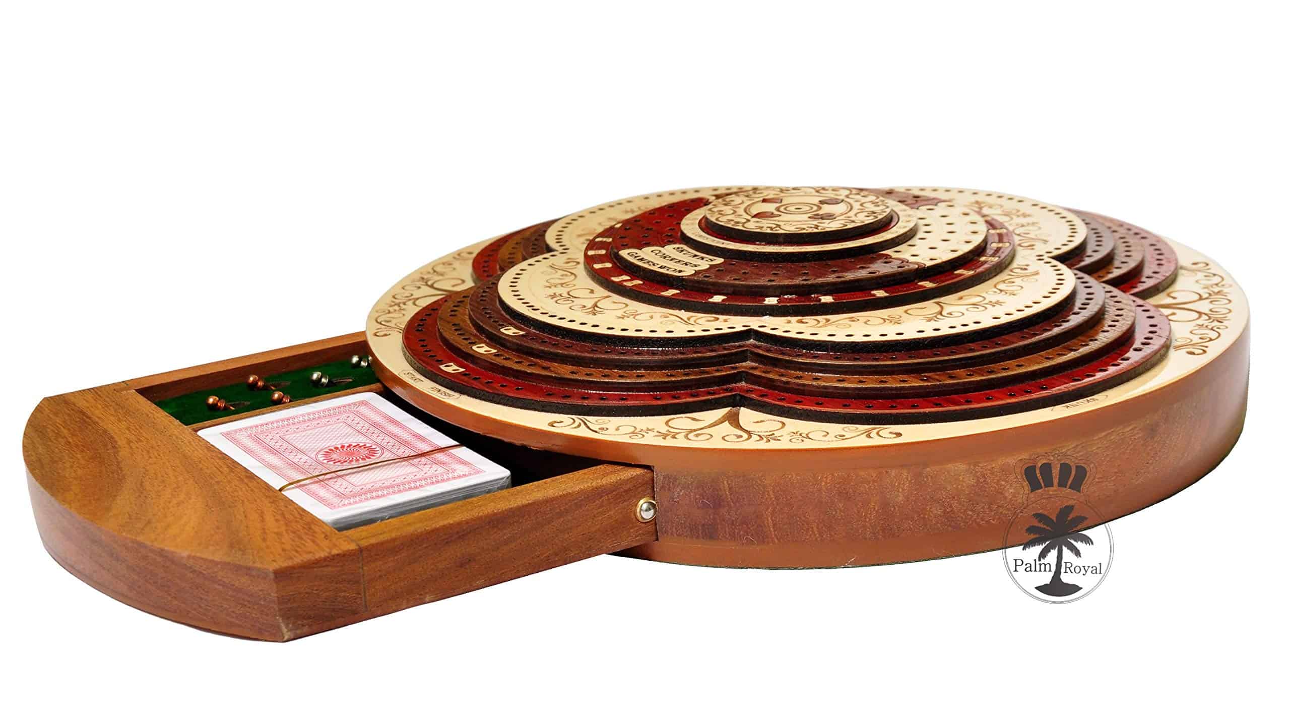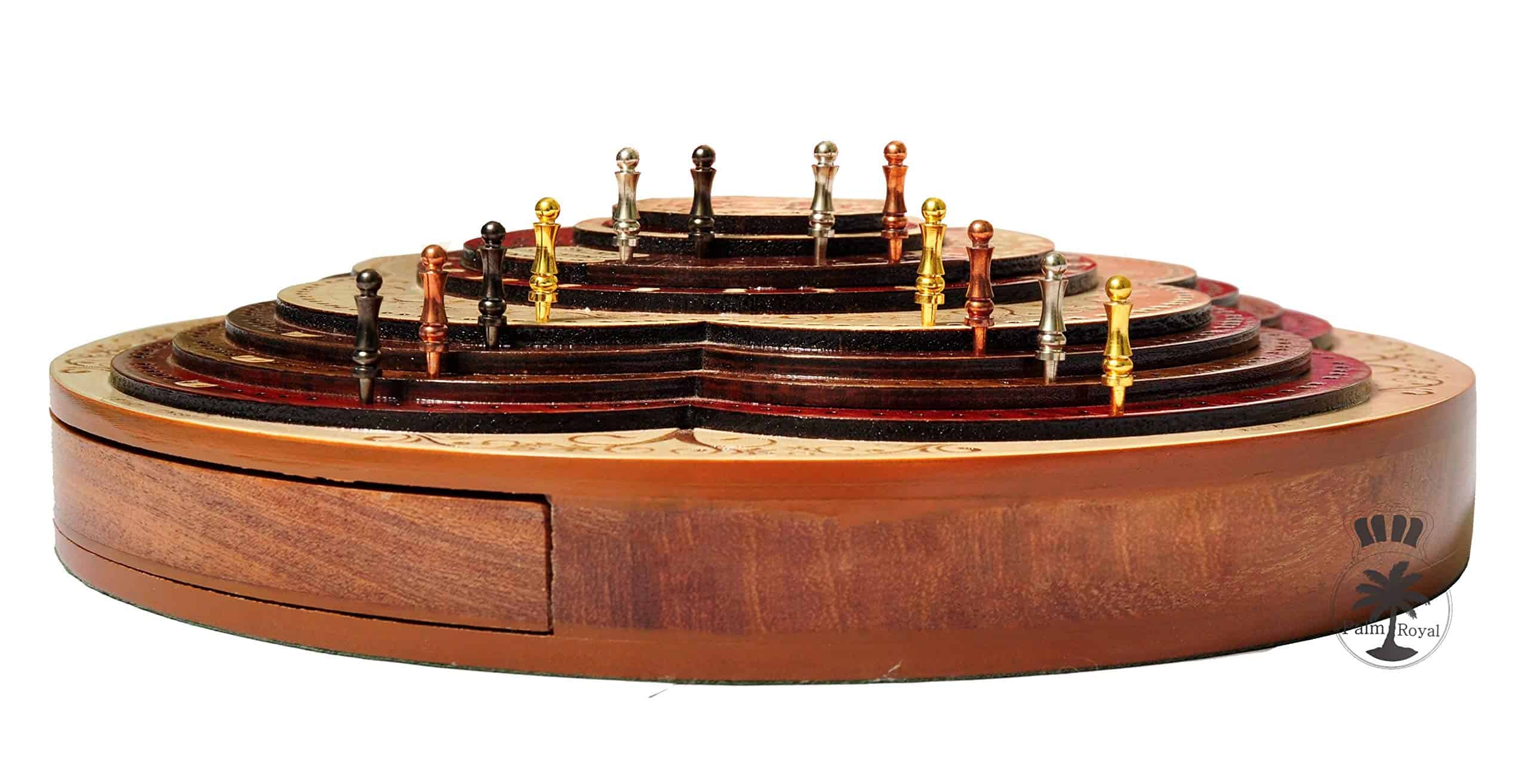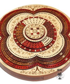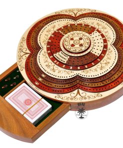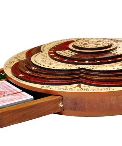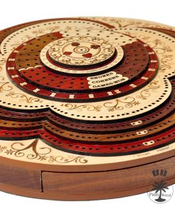 PALM ROYAL HANDICRAFTS presenta un exclusivo Juego de Cribbage 3D de 4 Pistas (120 casas) en Forma Redonda con Pista de Flor con cajón de empuje. Todas las pistas están posicionadas en pasos, cada pista sobre la otra. El tablero de forma redonda tiene cajones para guardar las cartas de juego y clavijas de latón. El cajón se puede abrir desde ambos lados del juego y tiene cerraduras de bola que evitan que se caiga. El tablero de cribbage 3D hecho a mano se ha realizado en 8 pasos. Las primeras 4 etapas están destinadas a las pistas de juego del 1 al 4 y otros pasos están destinados a Notaciones alfanuméricas, Juegos ganados, esquinas, skunks. La siguiente tabla muestra la descripción detallada de pasos y maderas. Dirección de los Pasos de abajo hacia arriba Paso 1: Pista de Juego Uno en Madera de Bloodwood. Paso 2: Pista de Juego dos en Madera de Teak. Paso 3: Pista de Juego tres en Madera de Rosewood. Paso 4: Pista de Juego cuatro en Madera de Maple y hay un hermoso diseño grabado Paso 5: Pista de Notaciones alfanuméricas incrustada con maple en Bloodwood Paso 6: Consta de Juegos Ganados, Esquinas y Skunks que están grabados en madera de maple y maderas de bloodwood rosewood teak y maple. Paso 7: Anillo numérico de madera de maple. Paso 8: Diseño grabado en madera de maple. Maderas Naturales: NO USAMOS serigrafías ni ninguna otra impresión para crear números. Todas las pistas están hechas en maderas naturales en colores originales.